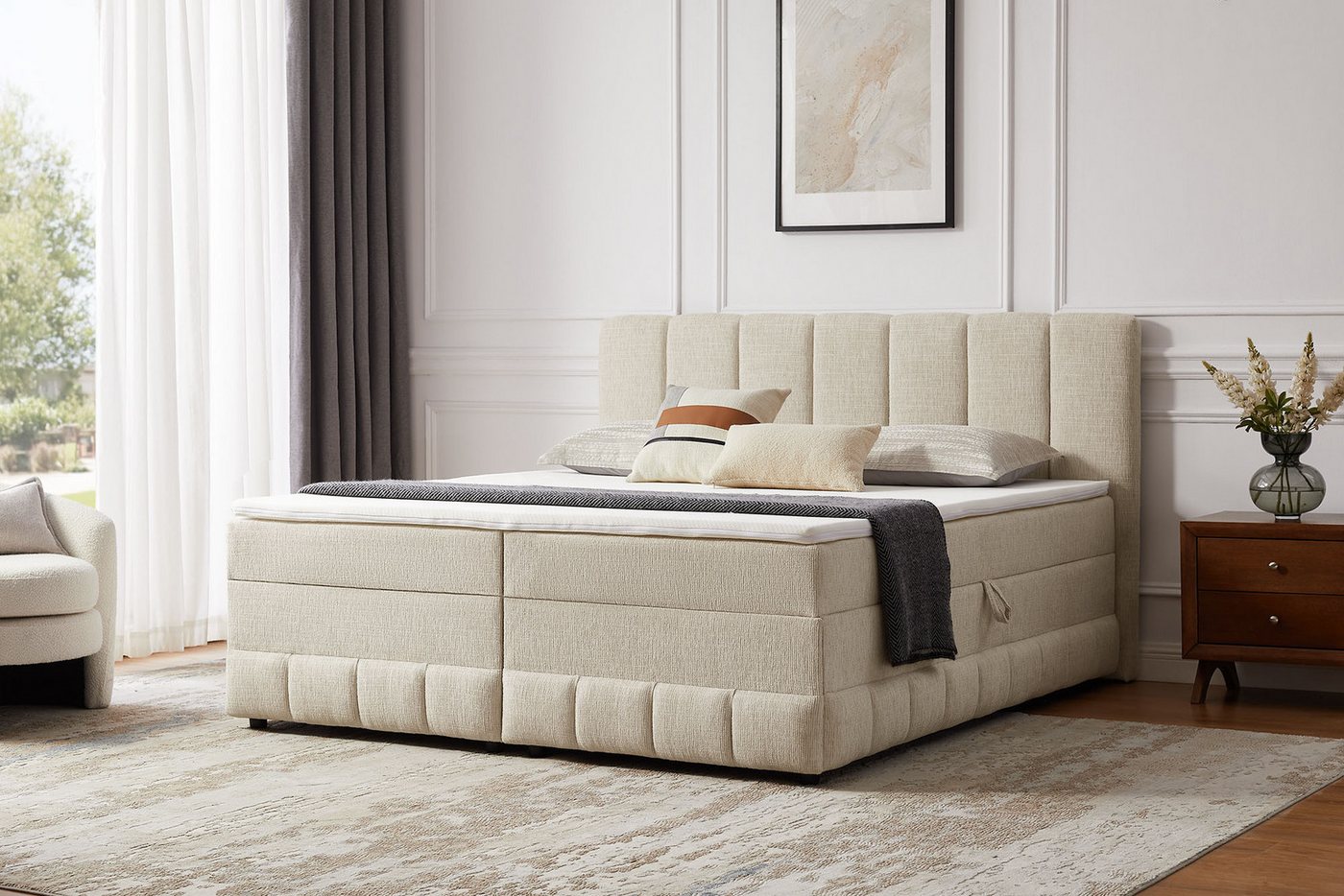 Produktdetails Markeninformationen , Seit 2001 begeistert uns Home affaire mit Landhausmöbeln zum Verlieben. Ob modern, romantisch oder natürlich traditionell – der Fantasie für wunderschönes Einrichten sind kaum Grenzen gesetzt., |Serie , Likely, | Ausstattung & Funktionen Anzahl Matratzen , 2 St., |Härtegrad Matratze , H3, |Matratze Körpergewicht von , 0 kg, |Matratze Körpergewicht bis , 100 kg, |Art Matratze , Tonnentaschen-Federkernmatratze, |Art Topper , Kaltschaum-Topper, |Raumgewicht Topper , 20 kg/m³, |Art Stauraum , Bettkasten, |Anzahl Bettkästen , 2 St., | Maßangaben Breite Liegefläche , 180 cm, |Länge Liegefläche , 200 cm, |Breite , 194 cm, |Länge , 213 cm, |Höhe Kopfteil , 114 cm, |Höhe Bettseite , 62 cm, |Höhe Fußteil , 62 cm, |Höhe Füße , 5 cm, |Höhe Topper , 4 cm, |Höhe Matratze , 17 cm, |Höhe Unterbox , 36 cm, |Liegehöhe , 62 cm, |Bodenfreiheit , 5 cm, |Breite Kopfteil , 194 cm, |Breite Fußteil , 180 cm, |Hinweis Maßangaben , Alle Angaben sind ca.-Maße., | Material Holzart , Eukalyptus Kiefer, |Material Unterbox , MDF, |Material Füße , Kunststoff, |Materialeigenschaften , hautfreundlich pflegeleicht strapazierfähig, |Holzart (botanisch) , Eucalyptus, |Holzart Unterbox , Eukalyptus, |Abriebfestigkeit Bezug Fußteil , 25000 Scheuertouren, |Bezug , Chenille, |Abriebfestigkeit Bezug Kopfteil , 25000 Scheuertouren, | Farbe Farbe , beige, |Farbe Unterbox , beige, |Farbe Füße , schwarz, |Farbe Topper , weiß, |Farbhinweise , Bitte beachten Sie, dass bei Online-Bildern der Artikel die Farben auf dem heimischen Monitor von den Originalfarbtönen abweichen können., | Lieferung & Montage Aufbauhinweise , inklusive Aufbauanleitung – eine zweite Person zum Aufbau wird empfohlen, |Lieferumfang , Aufbauanleitung Matratze Topper, |Lieferzustand , zerlegt, | Wissenswertes Wissenswertes , Bettkasten ist mit einem Stoff als Staubschutz ausgestattet. Montagematerial befindet sich im Kopfteil, |