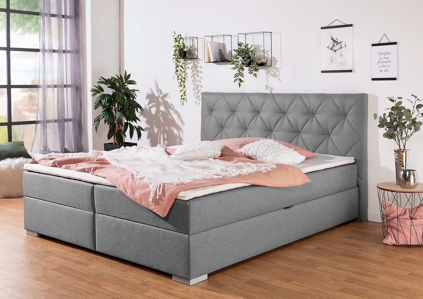 Mit Bettkasten ausgestattetes Bett Versehen mit einem praktischen Bettkasten lassen sich bei diesem Boxbett »Tynan« von Home affaire die Tagesdecke und Kissen schnell verstauen. Die hochwertige Taschen-Federkernmatratze mit einer Höhe von 20 cm stützt mithilfe ihrer Federn einzelne Körperpartien ab und sorgt so für einen angenehmen Liegekomfort und erholsamen Schlaf. Mit dem Härtegrad H4 ist sie für ein Körpergewicht bis zu 120 kg geeignet. Der Komfortschaum-Topper ist 4 cm hoch und liegt als zusätzliche Lage auf der Matratze auf. Dabei erhöht er den Schlafkomfort und rundet dein Schlafsystem ab. Das Kopfteil ist 112 cm hoch. Das Montagematerial ist im Lieferumfang enthalten, sodass du dir keine Gedanken um das richtige Werkzeug machen musst. Da das Produkt teilmontiert bei dir ankommt, dauert es nicht mehr lange bis es einsatzbereit ist. Bett mit Füßen aus Holz Die eckigen Füße sind aus Holz gefertigt und damit besonders langlebig. Der Strukturstoff des Bezugs zeigt sich durch die miteinander verwobenen Faserstränge mit einer charakteristischen Oberfläche. Das Herstellungsland Deutschland ist für seine hohe Qualität bekannt. Klassisches Design richtig kombiniert Mit diesem Möbelstück bringst du eine zeitlose Formensprache in deine Einrichtung. Hochglanzoberflächen und Elemente aus Chrom oder Edelstahl runden den modernen Wohnstil ab. Indem du die Dekoration in dezenten Farben wie Weiß oder Grau hältst und dich aufs Wesentliche fokussierst, hebst du den Stil noch besser hervor. Verwandle das Schlafzimmer zu deinem neuen Lieblingsort — mit dem Boxbett »Tynan« von Home affaire.
