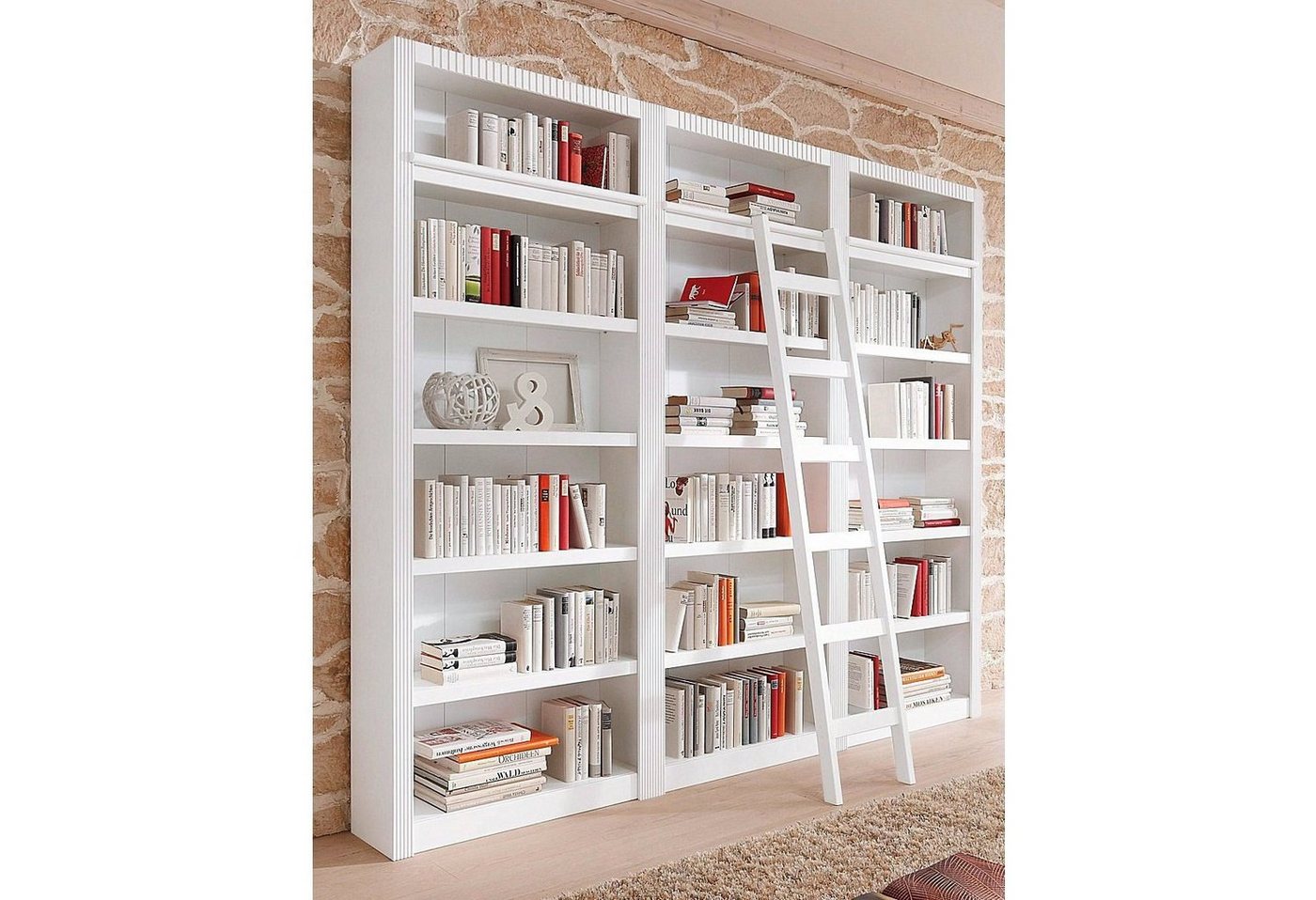 Das 3-tlg. Home affaire Regal »Bergen« aus Massivholz bringt zusätzlichen Stauraum in den Wohnbereich. Es ist im klassischen Landhausstil gehalten und überzeugt mit seinem natürlichen Material und der dekorativen Rahmenoptik. Das Standregal ist aus FSC®-zertifiziertem Massivholz der Kiefer gefertigt, welches die natürliche Facette unterstreicht. Dabei hält das Landhausmöbel viel Platz für Bücher, schicke Wohnaccessoires und mehr bereit. Es besteht aus einem Grundregal, das durch zwei Anbauregale ergänzt werden kann. Mit festen sowie auch mit verstellbaren Einlegeböden ausgestattet, lässt es sich so dem Platzbedarf entsprechend anpassen. Eine klassisch schöne Wohnwand-Variante, die jedes Zuhause bereichern kann: das 3-tlg. Regal »Bergen« aus Massivholz von Home affaire.