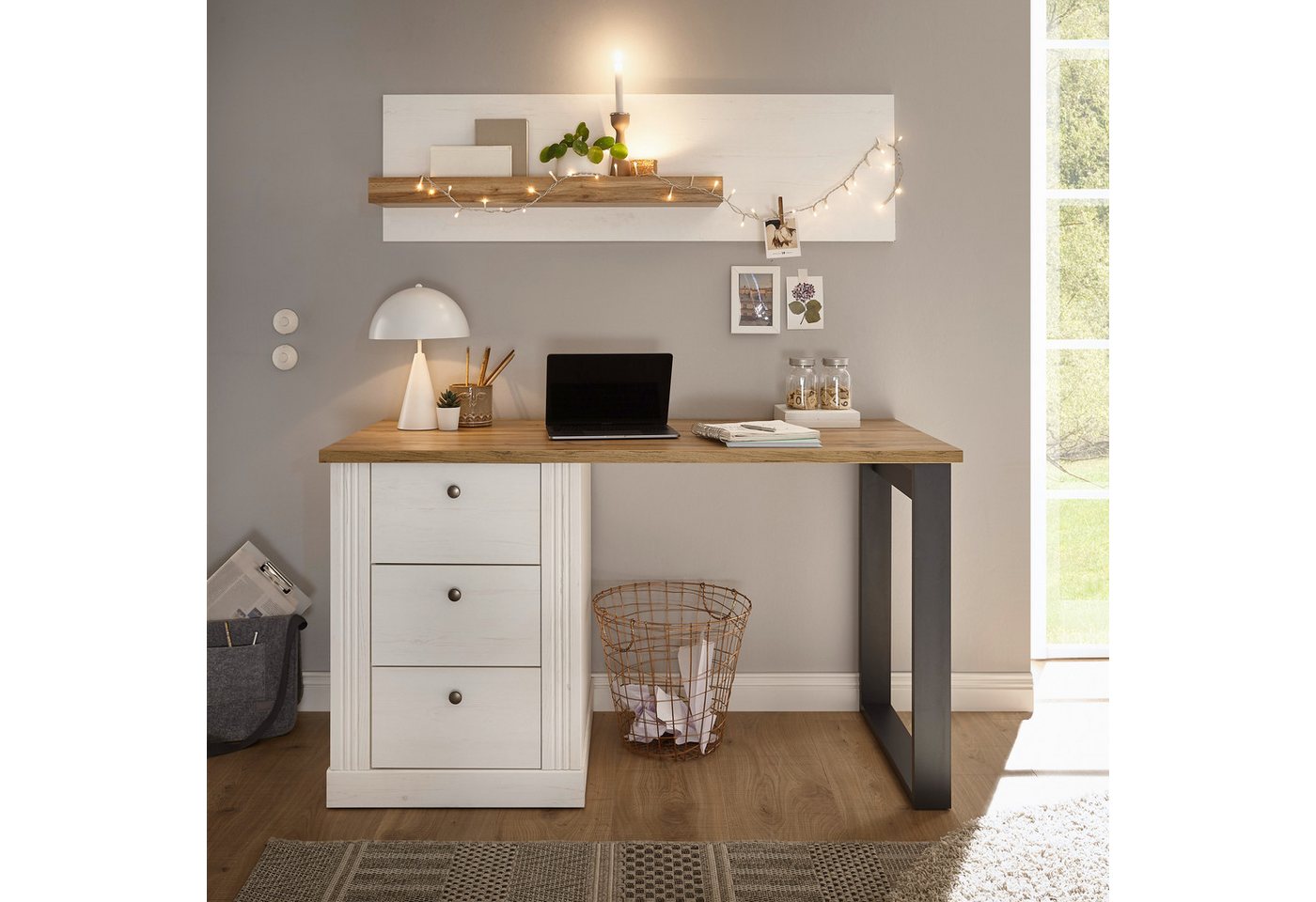 Bürokombination für dein Homeoffice: Bei dem Büromöbel Set »Westminster« von Home affaire im romantischen Landhausstil gehen Form und Funktion Hand in Hand. Optisch begeistert das Möbel-Set fürs Büro durch die rustikal-gemütliche Formensprache. Diese zeigt sich unter anderem in den Fräsungen auf den Fronten sowie die schicken Griffe. Das Komplettbüro besteht aus einem Schreibtisch mit Stauraumelement sowie einem Wandregal. Daher kannst du hier auch Unterlagen und Büroutensilien ordentlich verstauen. Das Home affaire Büromöbel Set »Westminster« im Landhausstil ist in mehreren Dekorkombinationen bestellbar.