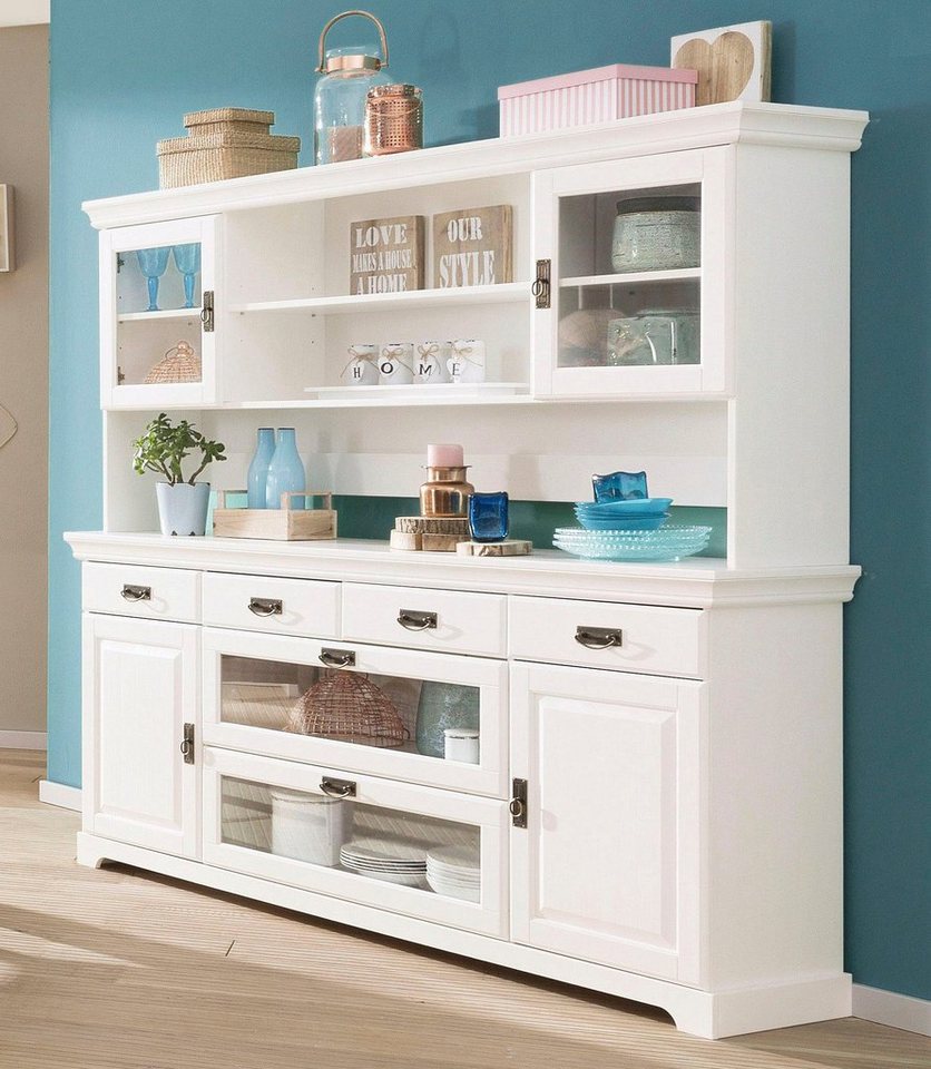 Ein attraktiver Blickfang mit rustikalen Elementen für dein Zuhause ist der Buffetschrank »Ruegen« aus dem Home affaire Sortiment. Die auffälligen Griffe auf den Schubladen und Türen heben sich kontrast stark ab. Dank seiner großzügigen Maße bietet er dir viel Stauraum. In den blickoffenen Bereichen hinter den Glaseinsätzen sowie auf den offenen Ablagen stellst du deine Lieblingsbücher, Dekofiguren und weitere Dinge ab. Alles andere findet seinen Platz in den Schubladen sowie hinter den Türen. Das Buffet wird in einer hohen Qualität aus Massivholz gefertigt und steht dir in attraktiven Farbausführungen zur Verfügung. Neben dem Wohnbereich eignet es sich zum Aufstellen in deinem Esszimmer. Der facettenreich gestaltete Buffetschrank »Ruegen« von Home affaire überzeugt mit einem aparten Look im Landhausstil.