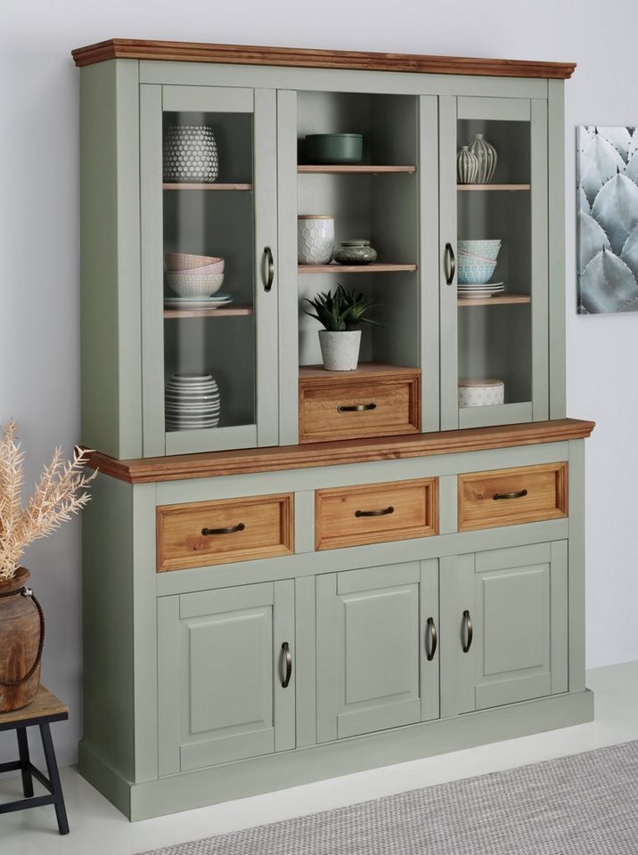 Schrank für Gläser und Geschirr Ob im Wohnzimmer, Schlafzimmer oder Flur — Mit diesem Buffet »Selma« von Home affaire schaffst du mehr Stauraum und Platz für den Fernseher oder schöne Deko-Elemente. Die Schubladen lassen sich komplett ausziehen und bieten dir weitere Unterbringungsmöglichkeiten. Um den Schrank genau auf deine Bedürfnisse auszurichten, sind die Einlegeböden flexibel einsetzbar. Das Wachs auf der Oberfläche macht das Holz unempfindlicher gegen Schmutz und Feuchtigkeit. Die modernen Bügelgriffe aus Metall sind stabil und nutzen sich daher nicht so schnell ab. Belastbar ist dein neues Möbelstück mit bis zu 150 Kilogramm. Wohnen im Landhaus-Stil Rustikal und gemütlich zugleich — das Buffet im Landhausstil lässt sich gut mit naturbelassenen Hölzern und natürlichen Stoffen wie Leinen, Baumwolle oder Flachs kombinieren. Dekorieren kannst du unter anderem mit Porzellan- oder Tonelementen, um das zwanglose Landhaus-Flair zu unterstreichen. Er ist Bestandteil der Serie Selma. Von dieser kannst du dich beim Einrichten inspirieren lassen. Macht dein Wohnzimmer komplett: das Buffet »Selma« von Home affaire!
