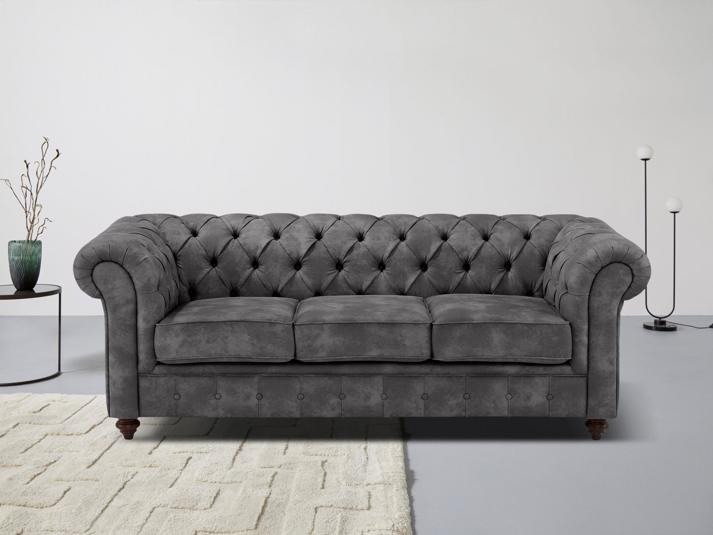 Ein attraktives Sitzmöbel im klassisch britischen Stil: der Sofa 3-Sitzer »Chesterfield« von Premium collection by Home affaire. Zu den besonderen Erkennungsmerkmalen gehören die auffällige Knopfheftung sowie die großzügig gemütlichen Armlehnen. Ein charmanter Blickfang, der zum gemütlichen Verweilen einlädt. Passend zum bestehenden Einrichtungsstil stehen verschiedene Bezugsqualitäten zur Verfügung. Dank Wellenunterfederung und atmungsaktiver Polyätherschaum-Polsterung sitzt es sich fühlbar bequem auf der geschmackvollen Couch. Die hochwertige Verarbeitung wird unterstrichen durch die Verwendung von FSC®-zertifiziertem Holzwerkstoff bei der Herstellung des stabilen Gestells. Ob an der Wand oder frei im Raum aufgestellt: der Sofa 3-Sitzer »Chesterfield« von Premium collection by Home affaire unterstreicht den britischen Wohnstil auf eine elegante Art.