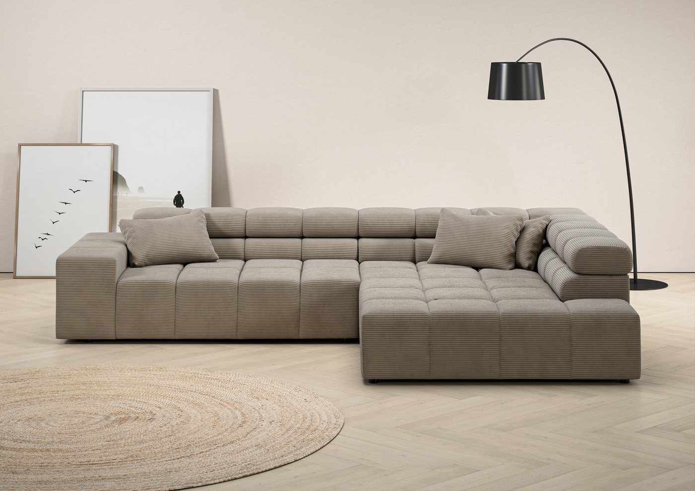 Mit seinem modernen Design bereichert das Ecksofa mit verstellbarer Kopfstütze »Ancona« aus der Kollektion von Home affaire das Zuhause. Optisch überzeugt es durch die quadratischen Elemente und die auffällige Steppung. Zur Auswahl steht die Eckcouch in verschiedenen Farbvarianten, unter denen sich der persönliche Favorit entdecken lässt. Für den angenehmen Sitzkomfort sorgt die softe Schaumpolsterung im Zusammenspiel mit der Wellenunterfederung. Zudem befinden sich die weichen Zierkissen im Lieferumfang. Optional ist das Sofa mit einem motorischen Sitzvorzug erhältlich. Das Home affaire Ecksofa »Ancona« mit verstellbarer Kopfstütze ist ein Sitzmöbel mit durchdachter Funktion.