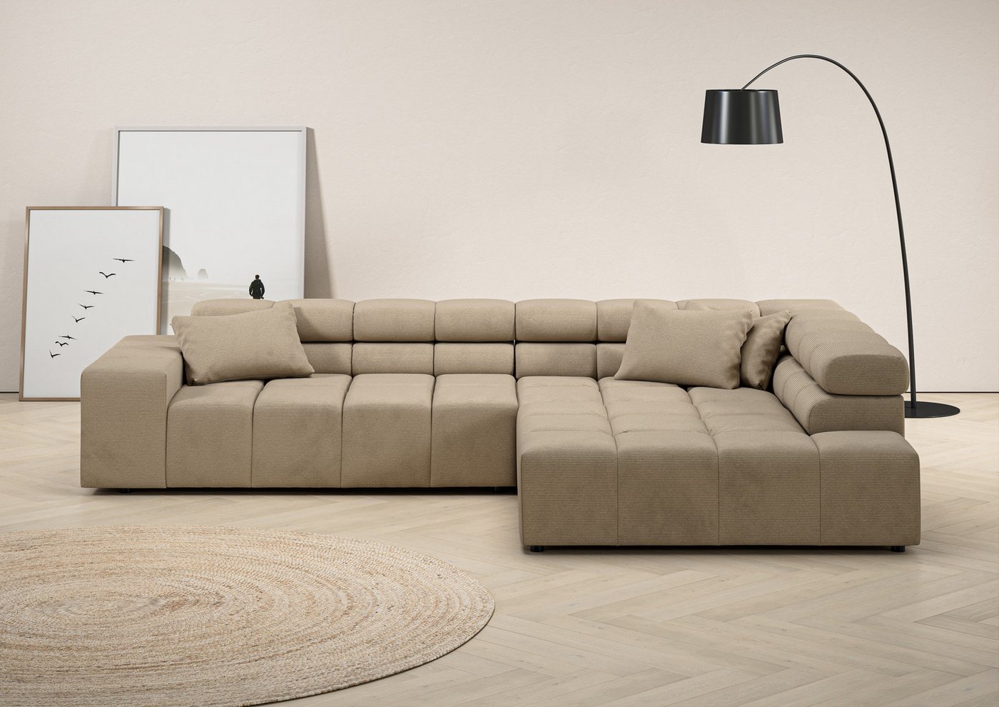 Mit seinem modernen Design bereichert das Ecksofa mit verstellbarer Kopfstütze »Ancona« aus der Kollektion von Home affaire das Zuhause. Optisch überzeugt es durch die quadratischen Elemente und die auffällige Steppung. Zur Auswahl steht die Eckcouch in verschiedenen Farbvarianten, unter denen sich der persönliche Favorit entdecken lässt. Für den angenehmen Sitzkomfort sorgt die softe Schaumpolsterung im Zusammenspiel mit der Wellenunterfederung. Zudem befinden sich die weichen Zierkissen im Lieferumfang. Optional ist das Sofa mit einem motorischen Sitzvorzug erhältlich. Das Home affaire Ecksofa »Ancona« mit verstellbarer Kopfstütze ist ein Sitzmöbel mit durchdachter Funktion.