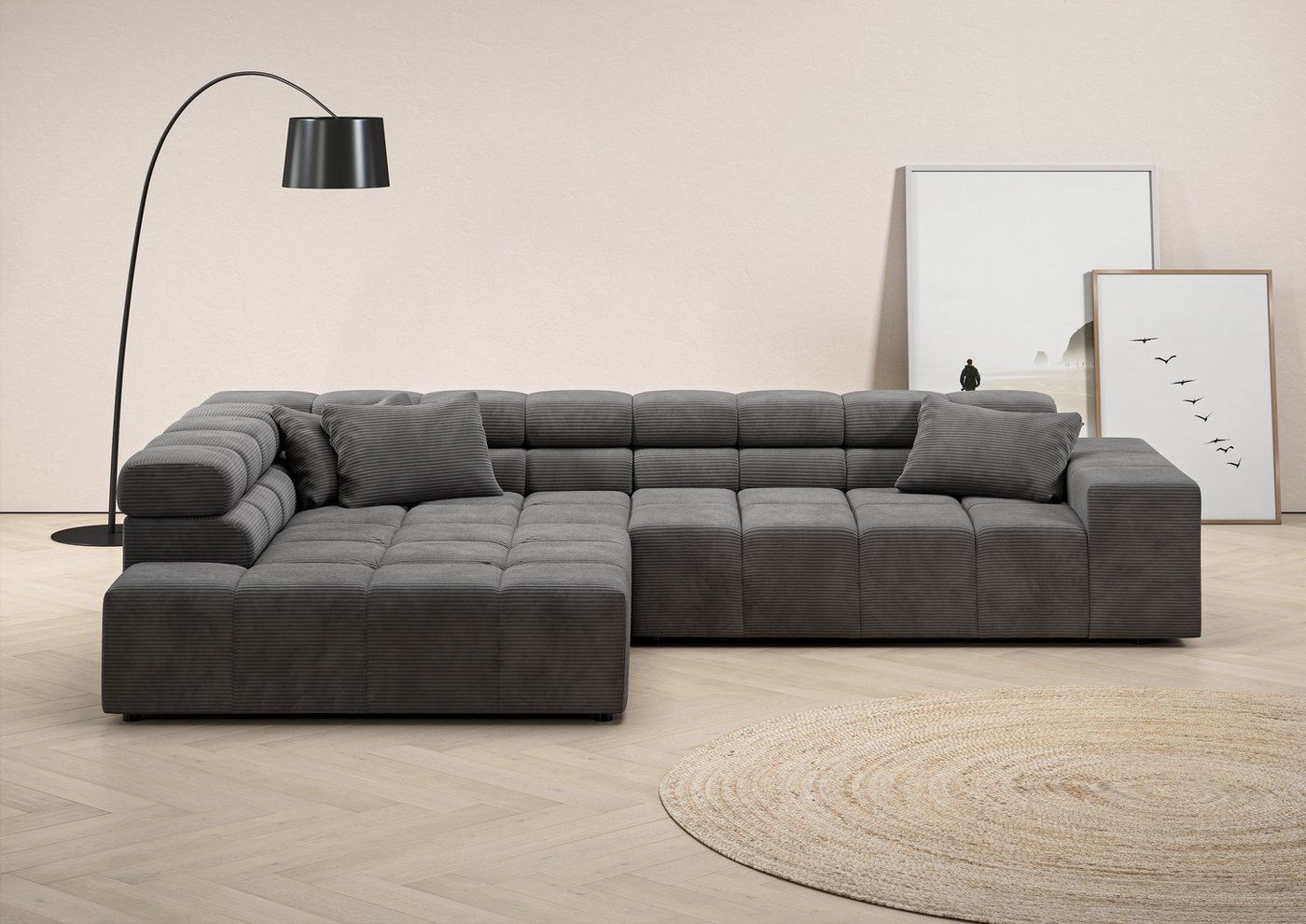 Mit seinem modernen Design bereichert das Ecksofa mit verstellbarer Kopfstütze »Ancona« aus der Kollektion von Home affaire das Zuhause. Optisch überzeugt es durch die quadratischen Elemente und die auffällige Steppung. Zur Auswahl steht die Eckcouch in verschiedenen Farbvarianten, unter denen sich der persönliche Favorit entdecken lässt. Für den angenehmen Sitzkomfort sorgt die softe Schaumpolsterung im Zusammenspiel mit der Wellenunterfederung. Zudem befinden sich die weichen Zierkissen im Lieferumfang. Optional ist das Sofa mit einem motorischen Sitzvorzug erhältlich. Das Home affaire Ecksofa »Ancona« mit verstellbarer Kopfstütze ist ein Sitzmöbel mit durchdachter Funktion.