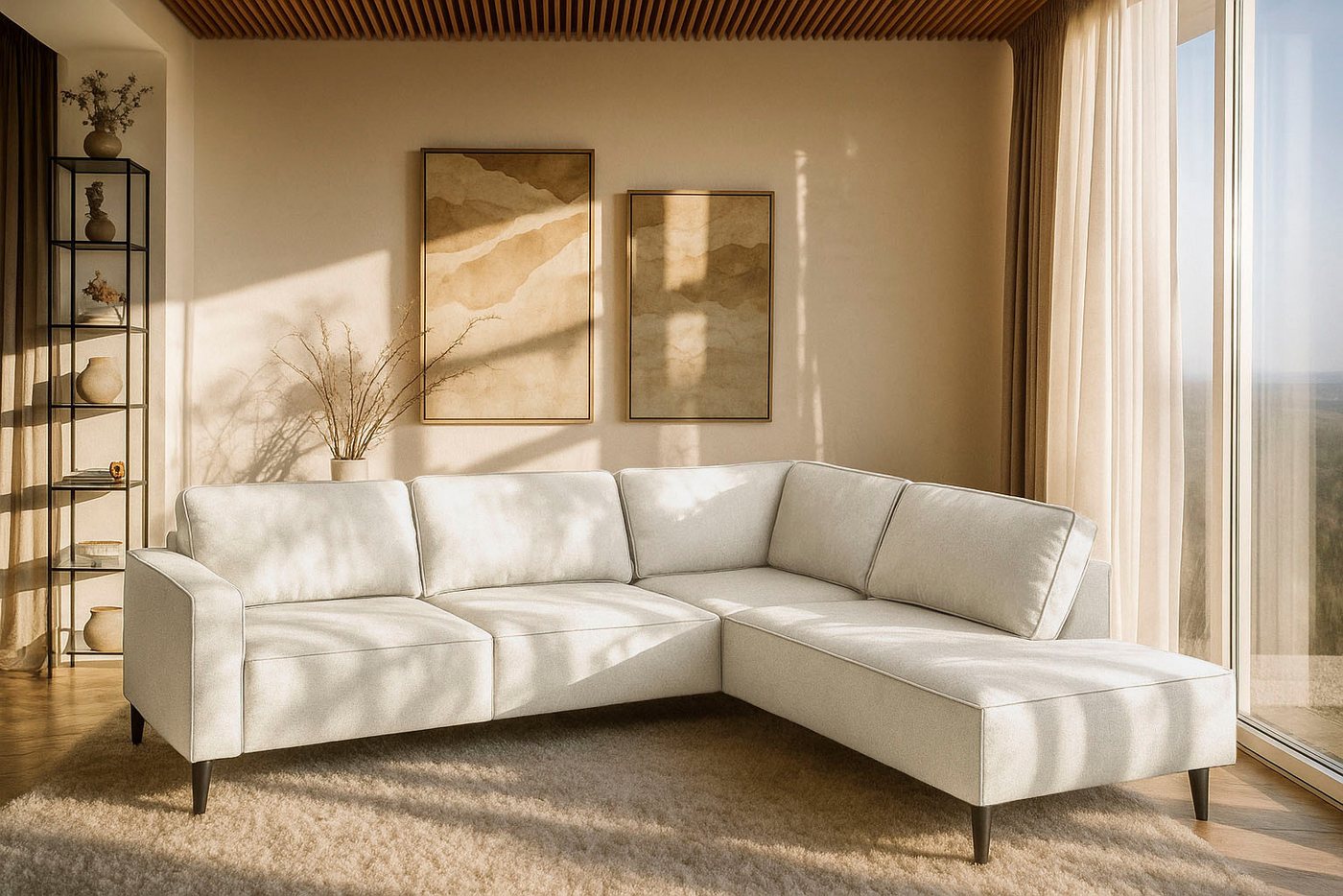 Sofa mit Kaltschaum Dieses Ecksofa »Fumone, Lederoptik oder Soft-Touch Chenille« von Places of Style bietet dir dank der Wellenunterfederung hohen Sitzkomfort und Tragfähigkeit. Von vorne betrachtet ist die Ottomane nach rechts ausgerichtet. Die maximale Belastbarkeit liegt bei einem Gewicht von 480 Kilogramm. Der Chenille-Webstoff zeigt sich mit einer schicken samtig wirkenden Oberfläche, die dem Velours ähnelt. So kannst du dein Wohnzimmer gestalten Du fragst dich, wie sich das Möbelstück kombinieren lässt? Hier eine kleine Inspiration für dich: Die Ästhetik des modernen Stils ist reduziert und strahlt eine schlichte Eleganz aus. Indem du die Dekoration in dezenten Farben wie Weiß oder Grau hältst und dich aufs Wesentliche fokussierst, hebst du den Stil noch besser hervor. Platz für alle — das Ecksofa »Fumone, Lederoptik oder Soft-Touch Chenille« von Places of Style.