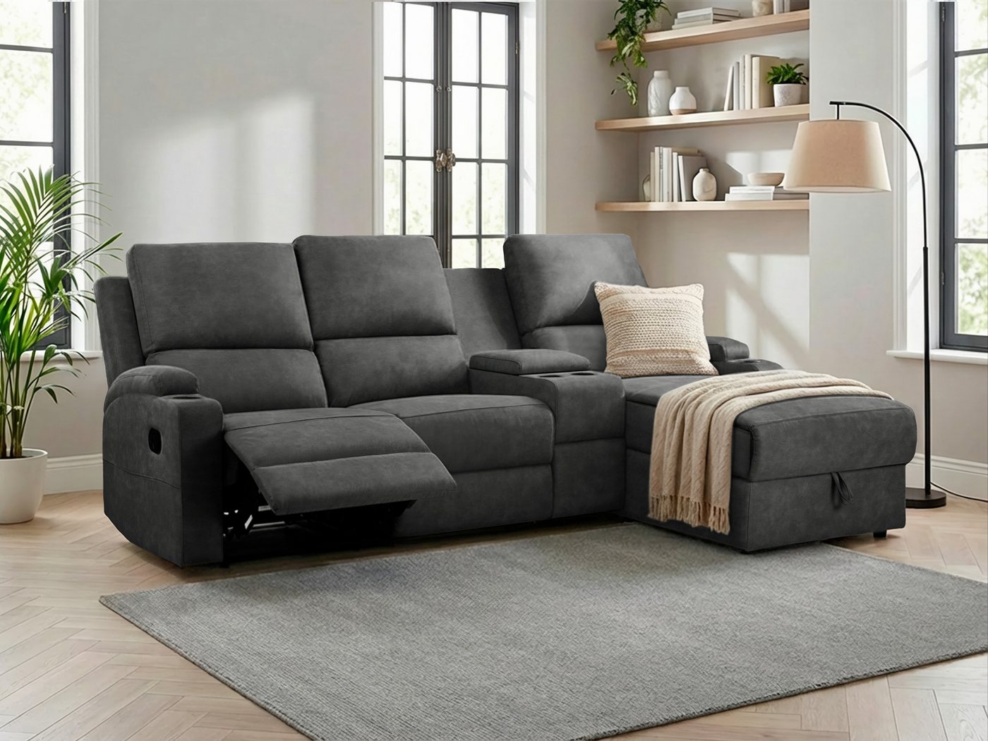 Sofa mit Federkern Hohe Sitzqualität und lange Lebensdauer bietet dir dieses Ecksofa »NAPORI Multimediasofa, 3er Kinosessel XXL, L-Form, 3 Bezugsstoffe« von Home affaire mit PUR-Schaumstoff-Polsterung. Darüber hinaus kannst du hiermit Gegenstände geschlossen in einem geschlossenen Innenfach aufbewahren, sodass sie leicht auffindbar sind aber nicht frei im Raum herum liegen. Das Produkt ist manuell verstellbar und lässt sich so mit wenigen Handgriffen in die gewünschte Position bringen. Von vorne betrachtet ist die Recamiere nach rechts ausgerichtet. Belastbar ist ein Sitzplatz bis zu 150 Kilogramm. Die Microfaser ist sehr pflegeleicht und strapazierfähig. Passend für dein Wohnzimmer Um die Möbelstücke im Vintage-Stil mit der restlichen Raumeinrichtung in Einklang zu bringen, eignen sich Deko-Artikel mit Gebrauchsspuren oder gewollten Schönheitsfehlern, die einen Hauch Nostalgie verbreiten. Wenn du Wohnaccessoires wie ein altes Radio oder Telefon auf dem Dachboden hast, wird es Zeit, diese wieder auszukramen. Mit dem Ecksofa »NAPORI Multimediasofa, 3er Kinosessel XXL, L-Form, 3 Bezugsstoffe« von Home affaire findet jeder einen kuscheligen Platz.