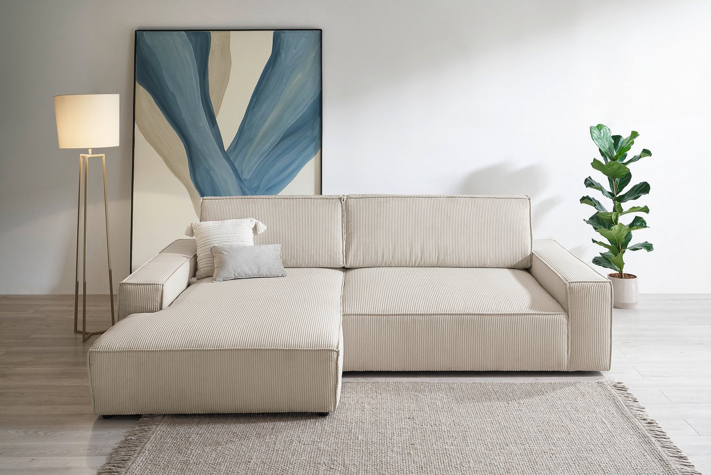 Sofa mit Komfortschaum Dieses Ecksofa »NEU: SHERWOOD XXL 284, Big-Sofa L-Form, tiefe Sitzfläche 95 cm, Cord« von Home affaire bietet dir dank der Wellenunterfederung hohen Sitzkomfort und Tragfähigkeit. Was dir auch zu Gute kommt, ist das passende Rückenkissen, das dekorativ und zugleich komfortabel ist. Beim Ecksofa befindet sich die Recamiere, von vorne betrachtet, auf der linken Seite. Bei etwa 350 Kilogramm liegt die maximale Belastbarkeit. Die schwarzen Füße wurden aus Kunststoff gefertigt und sind daher temperatur- und formbeständig. Inspiration für dein Wohnzimmer Mit diesem Möbelstück bringst du eine moderne Formensprache in deine Einrichtung. Hochglanzoberflächen und Elemente aus Chrom oder Edelstahl runden den modernen Wohnstil ab. Um Akzente zu setzen, eignen sich beispielsweise farbige Vasen gut, die entweder mit Blumen oder auch mit bunten Lichterketten dekoriert werden können. Platz für alle — das Ecksofa »NEU: SHERWOOD XXL 284, Big-Sofa L-Form, tiefe Sitzfläche 95 cm, Cord« von Home affaire.