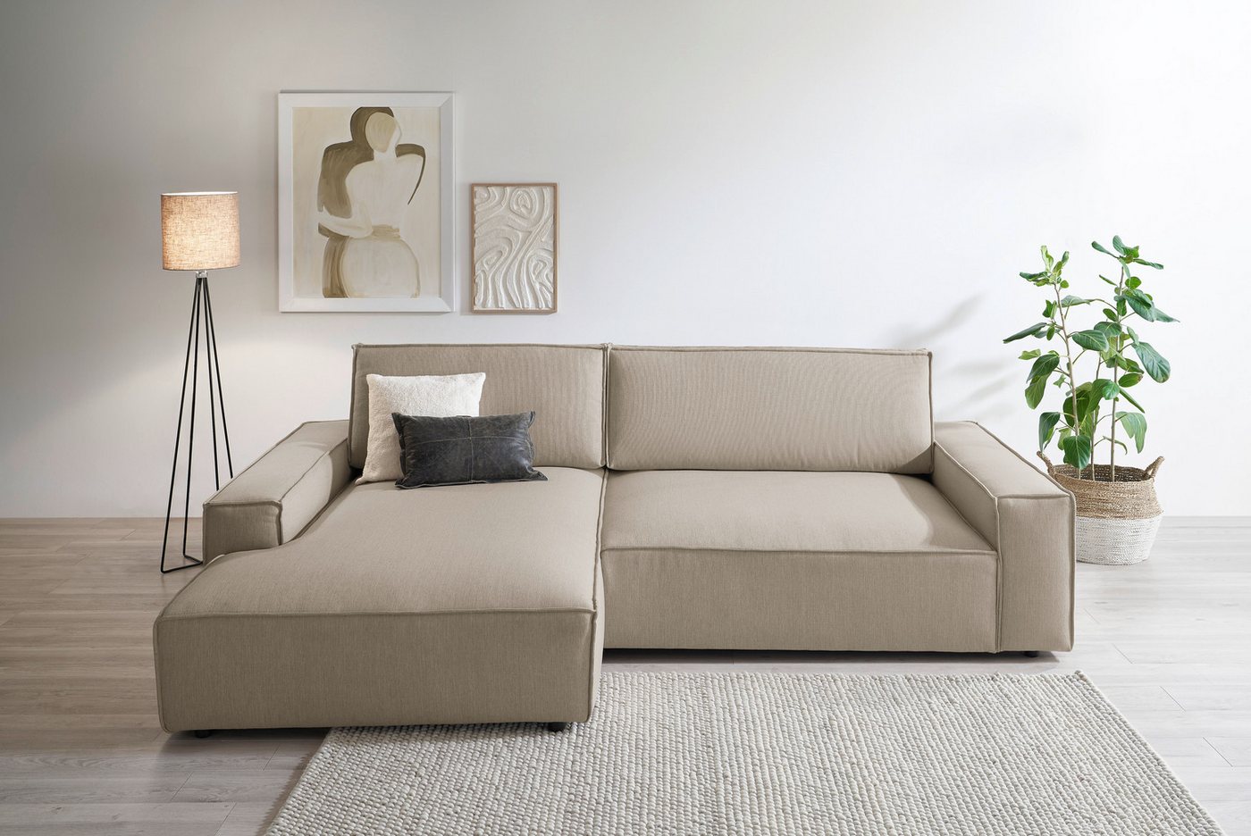 Sofa mit Komfortschaum Durch die hochwertige Wellenunterfederung wird die Sitzfläche des Ecksofas »NEU: SHERWOOD XXL 284, Big-Sofa L-Form, tiefe Sitzfläche 95 cm, Cord« von Home affaire gut gefedert und bleibt dauerhaft elastisch. Ein weiterer Vorteil ist das passende Rückenkissen, das nicht nur ein schönes Deko-Element ist, sondern auch für noch mehr Komfort sorgt. Von vorne betrachtet ist die Recamiere nach links ausgerichtet. Belastbar ist dein neues Möbelstück bis zu 350 Kilogramm. Die schwarzen Füße aus Kunststoff punkten mit der Temperaturbeständigkeit und sind zudem formstabil. Wohnzimmer im modernen Stil Mit diesem Möbelstück bringst du eine moderne Formensprache in deine Einrichtung. Hochglanzoberflächen und Elemente aus Chrom oder Edelstahl runden den modernen Wohnstil ab. Um Akzente zu setzen, eignen sich beispielsweise farbige Vasen gut, die entweder mit Blumen oder auch mit bunten Lichterketten dekoriert werden können. Damit verpufft die Sorge um Sitzplatzmangel — das Ecksofa »NEU: SHERWOOD XXL 284, Big-Sofa L-Form, tiefe Sitzfläche 95 cm, Cord« von Home affaire.