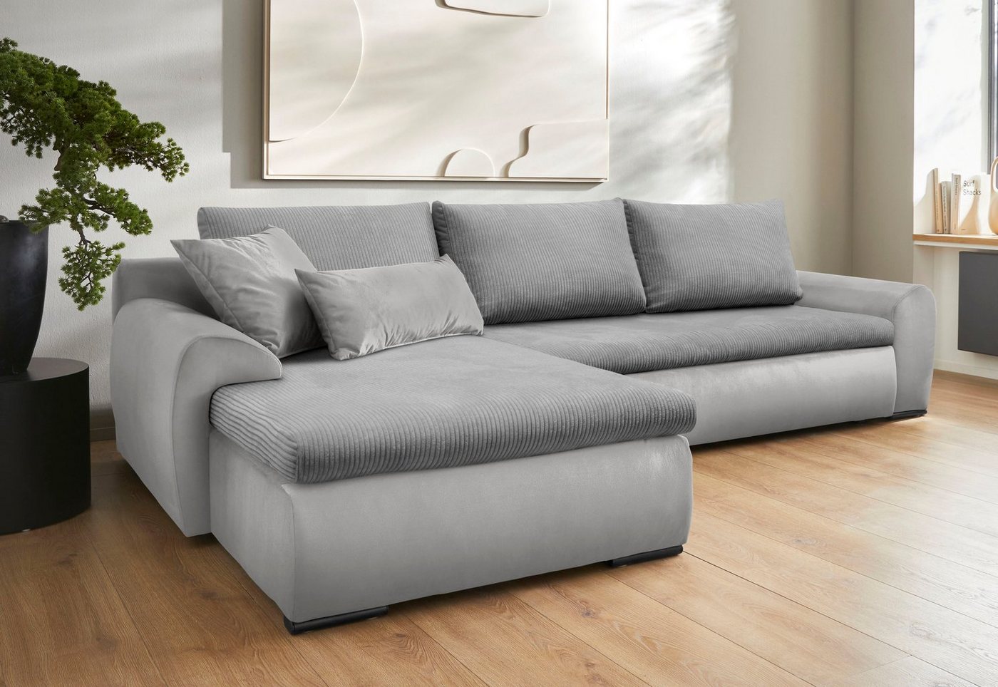 Sofa mit PUR-Schaumstoff Hohe Sitzqualität und lange Lebensdauer bietet dir dieses Ecksofa »Win L-Form, B: 285 cm – OTTO. Verlässliche Qualität.« von Home affaire mit PUR-Schaumstoff-Polsterung. Darüber hinaus verfügt das Möbelstück über einen Bettkasten, sodass es sowohl als gemütliche Sitzgelegenheit für den Tag als auch als Gästebett genutzt werden kann. Ein weiterer Vorteil sind die passenden Zierkissen, die dekorativ und zugleich komfortabel sind. Die Recamiere kann sowohl links als auch rechts montiert werden. Der Bezug besteht aus Samtvelours — einem Material mit angenehmen, weichen Griff. Aus Liebe zum Detail wurde dieses Modell von Hand angefertigt. So kannst du dein Wohnzimmer gestalten Das Modell zeigt sich im klassischen Stil und kreiert ein traditionelles und zugleich edles Ambiente. Zur Inspiration: Große Spiegel, Schränke und Regale aus dunklen Hölzern sowie schicke Akzente durch Kerzenständer passen besonders gut dazu. Damit verpufft die Sorge um Sitzplatzmangel — das Ecksofa »Win L-Form, B: 285 cm – OTTO. Verlässliche Qualität.« von Home affaire.