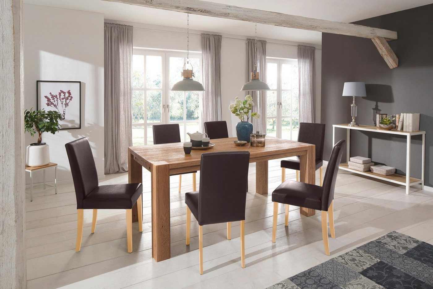 Produktdetails Produktdetails , Das 7tlg. Essgruppenset »Liva« der Marke Home affaire besteht aus einem 6er Set »Lucca« Stühle und dem Esstisch »Mary«. Die Stühle haben eine schöne Sitzpolsterung und einen bequemen Sitzkomfort. Zusätzlich bieten wir den »Mary« Esstisch in 2 verschiedenen Farben an. Die Referenzartikelnummern finden sie weiter unten auf unserer Seite. Das Holz ist aus FSC®-zertifizierten Massivholz. Alle Maße sind ca.-Maße. Aufbauanleitung zur Selbstmontage ist inklusive. Details der Esstisch: Auch verlängerbar durch Ansteckplatte (Verlängerbar auf 240-260 cm, zusätzlich bestellbar), 2 cm STARKE Tischplatte an den Rändern auf 4 cm verstärkt, In 2 verschiedenen Farben erhältlich, Rechteckige Tischplatte, Tischplatte fest montiert, 64 cm vom Boden bis zur Tischzarge, Tischbeine 12/13 xm, Das Holz ist aus massiver Wildeiche, Ansteckplatte separat bestellen (Artikelnummer: 82081284,79393270), ca.-Maße: Maße (B/T/H): ca. 180/90/75 cm, 76 cm Tischhöhe, 2 cm STARKE Tischplatte an den Rändern auf 4 cm verstärkt, 64 cm vom Boden bis zur Tischzarge, Tischbeine 13/13 cm, Alle Maße sind ca.-Maße, Details zu den 6er Stuhlset: Gestell aus Massivholz, Gestell aus Kiefer, Sitz- und Rückenpolsterung, Pflegeleichtes Material, In verschiedenen Farben erhältlich, FSC®-zertifizierter Massivholz, ca.-Maße: Gesamtmaße (B/T/H): ca. 43/56/92 cm, 47 cm Sitzhöhe, 41 cm Sitztiefe, Alle Maße sind ca.-Maße, Material: FSC®-zertifiziertes Massivholz des Esstisches: Wildeiche, Stuhlbeine aus massivem Kiefernholz, Stuhlbezug aus Webstoff (100% Baumwolle), Informationen zu Lieferumfang und Montage: Selbstmontage mit Aufbauanleitung, Pflegehinweise: Pflegehinweise für Möbel aus Holzwerkstoffen (inklusive Melamin und MDF): Verwenden Sie zur Pflege Ihrer Möbel aus Plattenwerkstoffen am besten ein weiches, nicht fusselndes Tuch oder ein Ledertuch. Wischen Sie die Oberflächen leicht feucht ab. , FSC®-zertifiziert: Das Label des FSC® weist nach, dass Sie mit dem Kauf dieser Produkte vorbildliche Waldwirtschaft – nach den strengen ökologischen, sozialen und wirtschaftlichen Standards des Forest Stewardship Council® – fördern und die Waldressourcen schonen., , |Markeninformationen , Seit 2001 begeistert uns Home affaire mit Landhausmöbeln zum Verlieben. Ob modern, romantisch oder natürlich traditionell – der Fantasie für wunderschönes Einrichten sind kaum Grenzen gesetzt., | Material Bezug , Kunstleder, | Farbe Farbe , Dunkelbraunfarbener Stuhlbezug, | Hinweise Hinweis Maßangaben , Alle Angaben sind ca.-Maße., |