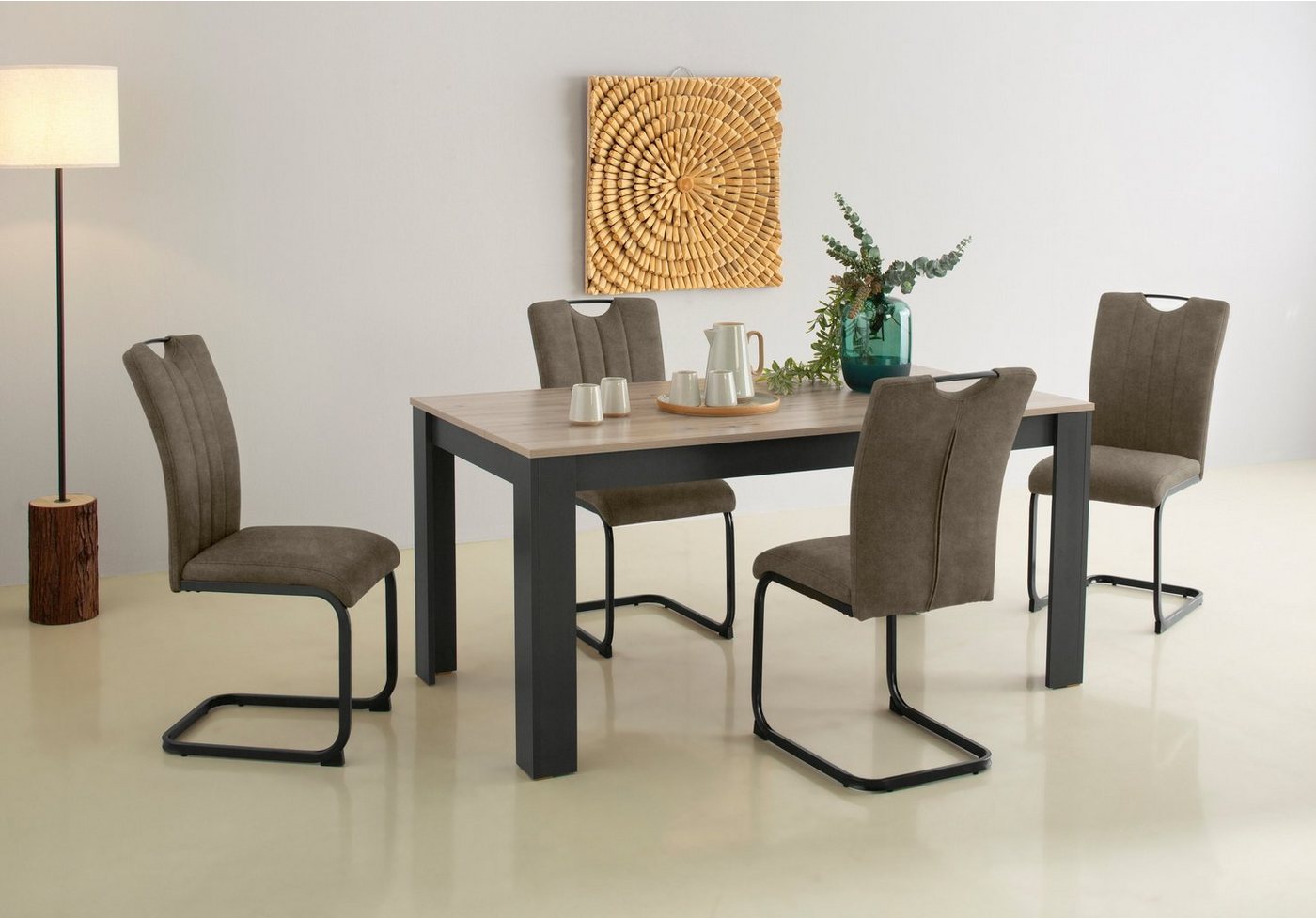 Produktdetails Markeninformationen , Seit 2001 begeistert uns Home affaire mit Landhausmöbeln zum Verlieben. Ob modern, romantisch oder natürlich traditionell – der Fantasie für wunderschönes Einrichten sind kaum Grenzen gesetzt., |Serie , DC Living Dining group, | Maßangaben Breite , 160 cm, |Tiefe , 88,5 cm, |Höhe , 75 cm, |Sitzhöhe , 48,5 cm, |Belastbarkeit maximal , 130 kg, |Belastbarkeit pro Sitzplatz , 130 kg, | Material Material , FSC®-zertifizierter Holzwerkstoff Melamin Polyester Polyurethan, |Material Gestell , Holzwerkstoff Melamin, |Optik , modernes Landhaus, |Bezug , Luxus-Microfaser Vintage, | Farbe Farbe , braun, |Farbhinweise , Bitte beachten Sie, dass bei Online-Bildern der Artikel die Farben auf dem heimischen Monitor von den Originalfarbtönen abweichen können., | Sitzmöbel Farbe Sitzfläche , braun, |Farbe Sitzmöbel Gestell , Anthrazit, |Material Sitzmöbel Gestell , Metall, | Ausstattung & Funktionen Art Polsterung , Schaumstoff, |Anzahl Sitzflächen , 4 St., |Polsteraufbau , Schaumstoff, | Tisch Anzahl Tische , 1 St., |Form Tisch , rechteckig, |Länge Tisch , 160 cm, |Breite Tisch , 88,5 cm, |Höhe Tisch , 75 cm, |Höhe Tischunterkante , 73,2 cm, |Materialstärke Tischplatte , 1,8 cm, |Farbe Tischplatte , Artisan Eiche, |Material Tischplatte , Holzwerkstoff Melamin, |Farbe Tisch Gestell , Anthrazit, |Material Tisch Gestell , Holzwerkstoff Melamin, | Stuhl Anzahl Stühle , 4 St., |Breite Stuhl , 43 cm, |Tiefe Stuhl , 60 cm, |Höhe Stuhl , 96,5 cm, |Sitzbreite Stuhl , 43 cm, |Sitztiefe Stuhl , 44 cm, |Sitzhöhe Stuhl , 48,5 cm, |Höhe Rückenlehne Stuhl , 51 cm, | Lieferung & Montage Lieferzustand , zerlegt, | Hinweise Pflegehinweise , Bitte beachten Sie die Pflegehinweise gemäß dem beiliegenden Produkt- und Materialpass. feucht abwischbar, |Lieferumfang , 4 Stühle + 1 Tisch, |Hinweise , Lieferung ohne Dekoration, |Aufbauhinweise , inklusive Aufbauanleitung – eine zweite Person zum Aufbau wird empfohlen, |Hinweis Maßangaben , Alle Angaben sind ca.-Maße., |