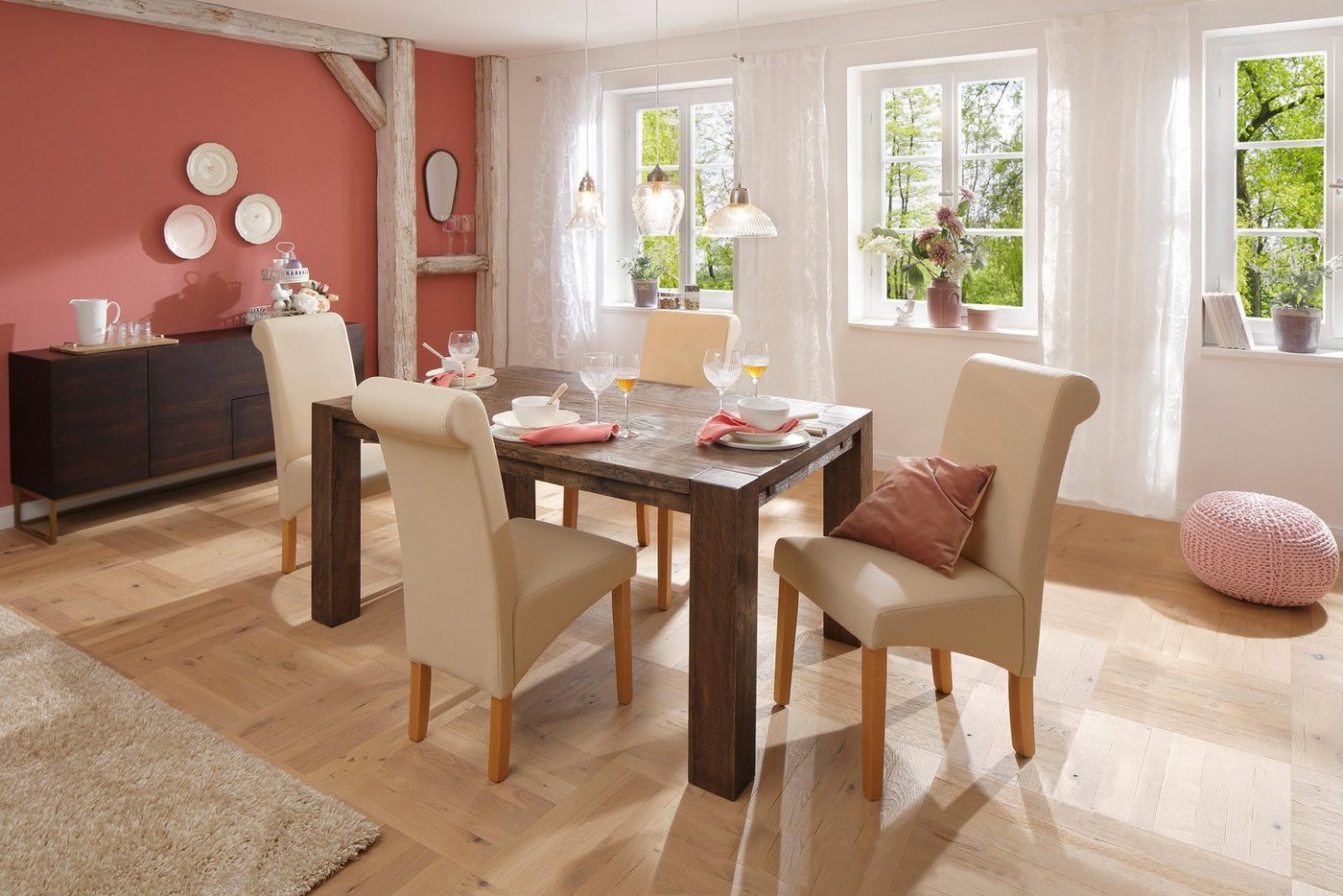 Mit seinem schicken Design überzeugt der Esstisch »Marianne« mit rustikaler Oberfläche von Home affaire. Hier erleben Sie »Natur pur« – die Tischplatte weist Astlöcher und leichte gewollte Risse auf, was für einen ganz natürlichen Look sorgt und somit zu einem absoluten Highlight wird. Bei der Herstellung kommt FSC®-zertifizierte massive Wildeiche zum Einsatz, was dem Esszimmerbereich eine natürliche Note verleiht. Es kann zwischen verschiedenen Größen sowie Farben gewählt werden – so lässt sich der Tisch individuellen Wünschen oder dem jeweiligen Raumkonzept anpassen. Um für weitere Gäste zusätzlichen Platz zu schaffen, ist außerdem eine Verlängerung mittels separat erhältlicher Ansteckplatte möglich. Überzeugt mit einem natürlichen Look und individuellen Gestaltungsmöglichkeiten: der Esstisch »Marianne« in Holzoptik von Home affaire.