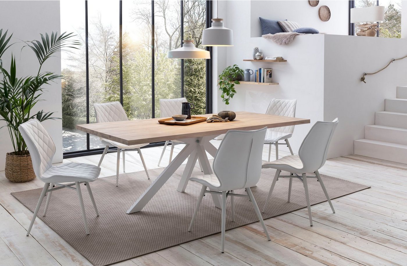 Unterstützt ein natürliches Wohnambiente in deinem Zuhause: Der Esstisch »Miami Beach« von Home affaire im Landhaus-Stil. Sein Design ist durch eine rechteckige Tischplatte in Holzoptik sowie durch ein helles Gestell aus Metall bestimmt. Das Esszimmermöbel ist ein Hingucker in modernen, zeitlosen oder skandinavischen Einrichtungen. Je nach vorhandenem Raumkonzept lässt es sich in verschiedenen Breiten bestellen. Qualitativ besticht der Tisch durch die Fertigung aus massiver Eiche. Seine Oberfläche punktet mit pflegeleichten Eigenschaften. Lädt zu gemütlichen Abendessen mit Familie und Freunden ein: der Esstisch »Miami Beach« von Home affaire im Landhaus-Stil.