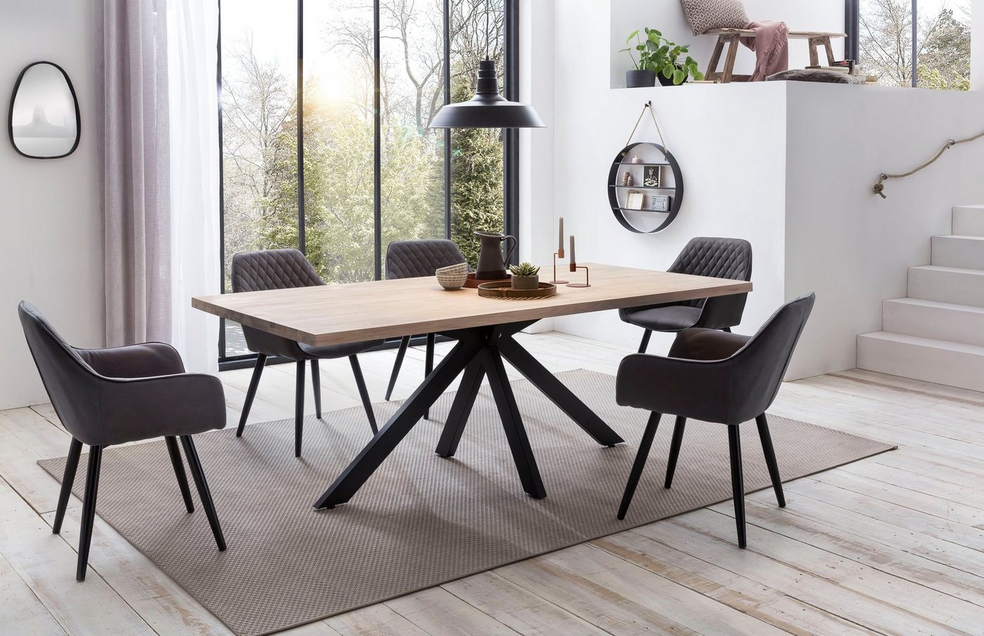Der moderne Esstisch »Miami Beach« von Home affaire bereichert dein Interieur mit seinem interessanten Materialmix. Während die Tischplatte mit einer attraktiven Holzoptik punktet, besteht das kontraststarke Spider-Gestell aus Metall. Kombinieren lässt sich der Esszimmertisch zu unterschiedlichen Einrichtungsstilen, von rustikal bis natürlich. Da er in mehreren Breiten erhältlich ist, kannst du ihn passend zu deiner bestehenden Raumsituation auswählen. Für die Fertigung des Esszimmermöbels kommt massive Eiche zum Einsatz. Seine Oberfläche überzeugt durch pflegeleichte Eigenschaften. Ein optischer Blickfang in jeder Einrichtung: der moderne Esstisch »Miami Beach« von Home affaire.