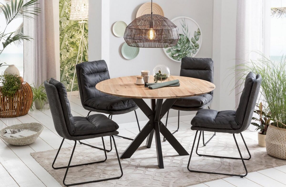 Besticht mit einem Metallgestell im modernen Spider-Look: der Esstisch »Quebec« von Home affaire. Die Tischplatte in traditioneller Rundform ist aus Massivholz mit kräftiger Maserung gefertigt, sodass ein ansprechender Kontrast entsteht. An Eleganz gewinnt sie durch die sich nach unten verjüngenden Kanten im Schweizer Stil. Die final geölten Oberflächen erweisen sich bei der Hausarbeit als pflegeleicht. Das Esszimmermöbel ist vielseitig kombinierbar und fügt sich harmonisch in ein zeitgemäßes ebenso wie in ein klassisches Ambiente ein. Der Esstisch »Quebec« von Home affaire setzt einen attraktiven Akzent im Raum dank des Metallgestells mit über Kreuz verlaufenden Standfüßen.