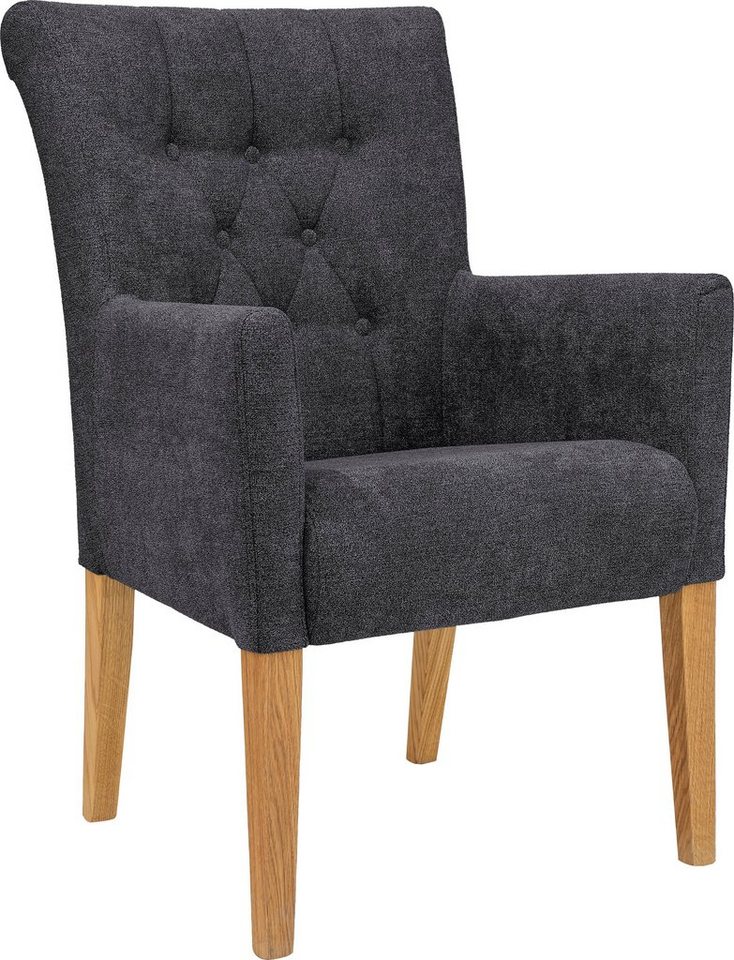 Im gemütlichen Landhausstil präsentiert sich der gepolsterte Armlehnstuhl »King« von Home affaire. Durch seine elegante Knopfheftung im Rücken fügt er sich als Blickfang in deinen Wohn-/Essbereich ein. Der Esszimmerstuhl besticht durch sein modernes Design, bei welchem die klare Formensprache überwiegt. Seine hohe Rückenlehne neigt sich bequem nach hinten. Hierzu passen die halbhohen Seitenteile, die in komfortable Armlehnen münden. Strapazierfähige Bezüge in attraktiver Strukturoptik definieren das Erscheinungsbild. Hierzu ist ein Vierfußgestell aus Massivholz kombiniert, das einen effektvollen Kontrast herstellt. In puncto Sitzkomfort kann der Sessel im Weiteren überzeugen: Alle Komponenten besitzen ein angenehmes Polster und sind ergonomisch angeordnet für ein ermüdungsfreies Sitzen. Der Stuhl überzeugt durch seine hochwertige Verarbeitung. Eignet sich als Beistellmöbel in deinem Schlafzimmer: der gepolsterte Armlehnstuhl »King« von Home affaire.
