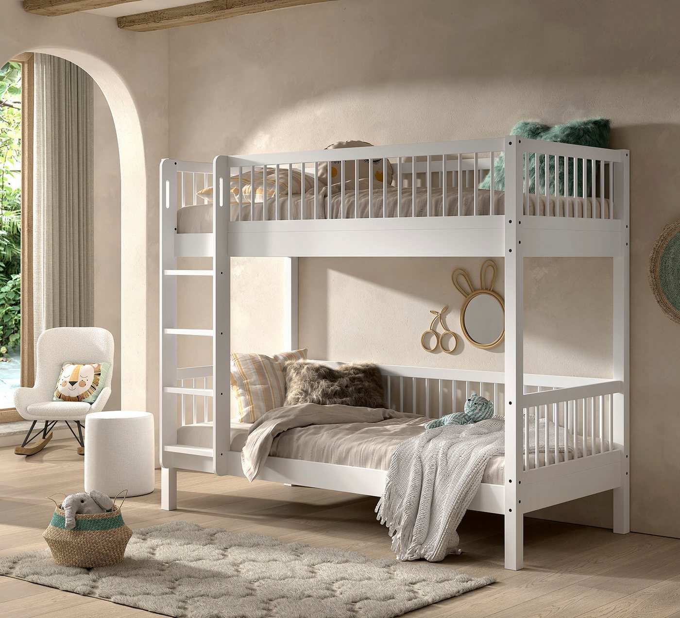 Kinder-Bett mit Schublade Dieses Etagenbett »Buche massiv weiß, Made in Europe, langlebige Qualität« von Home affaire verfügt über eine Schublade, wodurch der Platz unter der Liegefläche optimal ausgenutzt und Stauraum für die Bettwäsche und Spielzeug geschaffen wird. Das Bett bietet 2 Schlafplätze. Das Bett ist mit einem Rollrost ausgestattet. Das Etagenbett ist 175,4 cm hoch. Mit 21,5 cm Bodenfreiheit kann die Fläche unterhalb des Bettes einfach gewischt oder gesaugt werden. Die Leiter kann auf der linken oder auch auf rechten Seite angebracht werden. Da das Gestell aus lackiertem Massivholz gefertigt ist, besticht es durch Stabilität und Langlebigkeit. Schöner und kindgerechter Einrichtungsstil Neben einem einladenden Rückzugsort und einem gemütlichen Schlafplatz braucht es noch die passenden Accessoires, um das Kinderzimmer zu vervollständigen. Aufbewahrungskörbe oder verspielte Lampen können die Einrichtung sogar noch kinderfreundlicher machen. Das Produkt ist Teil der Forrest Buche-Serie. Weitere Artikel aus der Serie lassen sich gut zum Bett kombinieren. Praktische Bettenlösung für ein Kinderzimmer zu zweit — das Stockbett »Buche massiv weiß, Made in Europe, langlebige Qualität« von Home affaire.