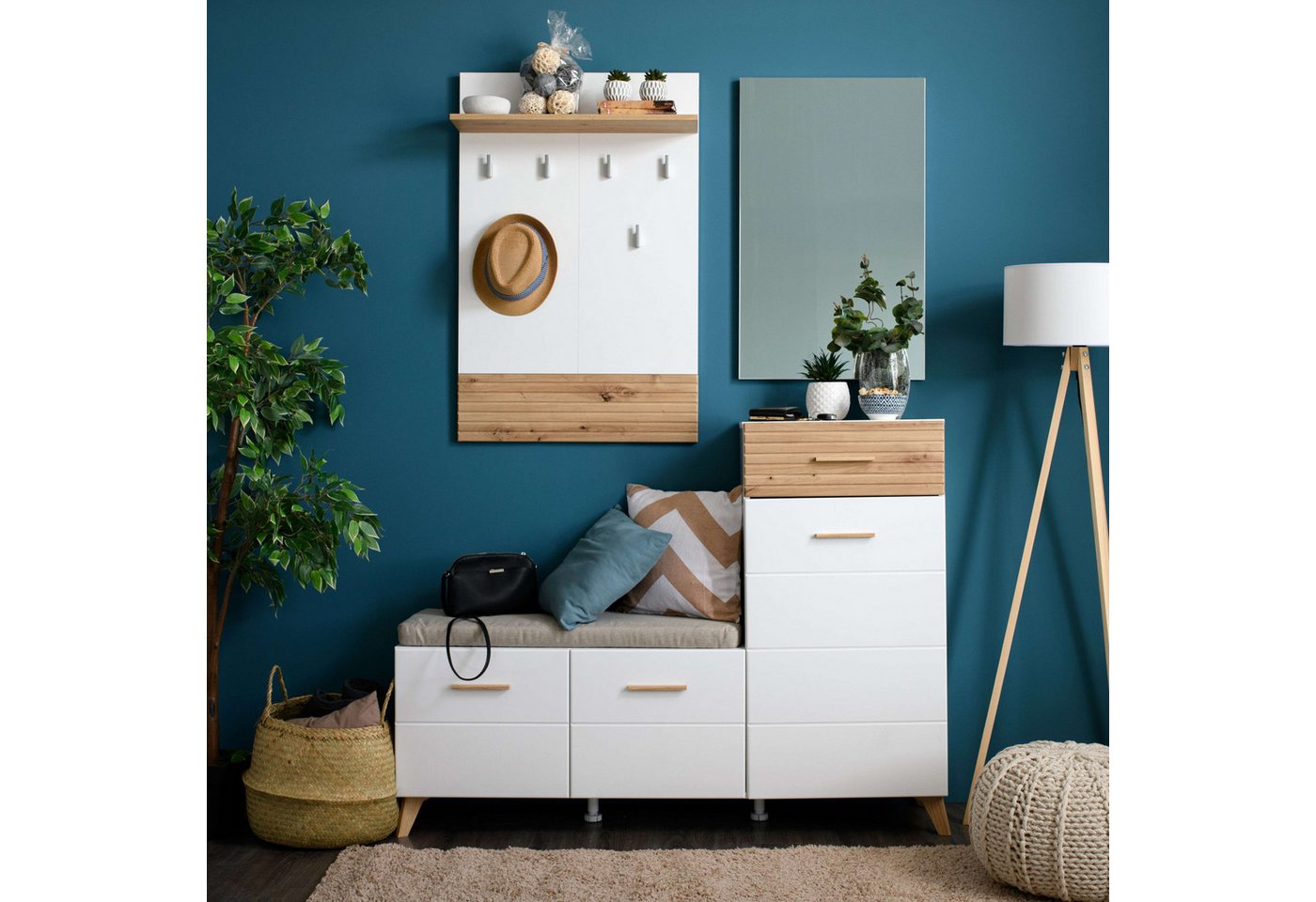 Produktdetails Set beinhaltet , Sein 4tlg Garderoben-Set besteht aus: 1 Schuhschrank, 1 Schuhbank, 1 Garderobenpaneel, 1 Wandspiegel, Details: FSC®-zertifizierter Holzwerkstoff, Pflegeleichte Oberflächen, Viel Stauraum, In hochwertiger Verarbeitung, Moderne Trendfarben, Farbe: Weißhochglanz folie, Opaque weiß, Artisan Eiche, Schuhschrank: 1x Schublade, 1x Tür, 2x Einlegeboden, Maße (B/T/H): ca. 51,4/34,8/106,5 cm, Belastbarkeit Einlegeboden: 5 kg, Belastbarkeit Schubladen: 2 kg, Schuhbank: 2x Türen, Belastbarkeit 32 kg, Innenmaße (B/T/H): ca. 63,6/33,2/93,5 cm, Maße (B/T/H): ca. 68,5/36,5/98 cm, Garderobenpaneel: 6x Haken,, 1x Hutablage, Maße (B/T/H) ca: 65,6/18/1,6 cm, Maße (B/T/H): ca. 66,4/19,6/102 cm, Wandspiegel: Maße (B/T/H): ca. 83,2/51,2/2 cm, Gesamtmaße: Gesamtmaße (B/T/H): ca. 263/40/167 cm, Alles ca.-Maße, Informationen zu Lieferumfang und Montage: Mit Aufbauanleitung, Selbstmontage mit Aufbauanleitung, Montagematerial inklusive, , |Serie , Sein, |Art Griffe , Griffleiste, | Farbe & Material Material Korpus , Spanplatte, |Oberflächenbehandlung Korpus , foliert, |Material Beschläge , Metall, |Oberflächenbehandlung Türen , foliert, |Material Einlegeböden , Spanplatte, |Material Schubladen , Holzwerkstoff, |Oberflächenbehandlung Schubladen , foliert, |Material Griffe , Kunststoff, |Farbe , Opaque weiß, |Material , Glas Hartfaserplatte Kunststoff MDF Metall Spanplatte, |Farbe Einlegeböden , Opaque weiß, |Farbe Griffe , Artisan Eiche, |Farbe Korpus , Opaque weiß, |Farbe Schubladen , Artisan Eiche, | Schrank Art Schrank , Schuhschrank, |Breite Schrank , 51,5 cm, |Tiefe Schrank , 35 cm, |Höhe Schrank , 106,5 cm, |Gewicht Schrank , 59,7 kg, |Anzahl Türen Schrank , 1 St., |Art Türen Schrank , Drehtür, |Anzahl Fächer Schrank , 3 St., |Belastbarkeit Einlegeböden Schrank , 5 kg, |Anzahl Schubladen Schrank , 1 St., | Spiegel Höhe Spiegel , 83,2 cm, |Form Spiegel , Rechtekig, | Garderobe Art Garderobe , Garderobenpaneel, |Anzahl Haken , 6 St., | Bank Höhe Bank , 53,9 cm, |Anzahl Fächer Bank , 3 St., |Anzahl Türen Bank , 2 St., |Material Bank , MDF Spanplatte, |Material Bezug , Polyester, | Maßangaben Breite , 141 cm, |Tiefe , 35 cm, |Höhe , 189,5 cm, | Lieferung & Montage Lieferumfang , Sitzkissen, Aufbauanleitung, |Lieferzustand , zerlegt, |Art Montage , Wandmontage stehend, |Aufbauhinweise , inklusive Aufbauanleitung – eine zweite Person zum Aufbau wird empfohlen, |Anzahl Packstücke , 3 St., | Hinweise Pflegehinweise , Bitte beachten Sie die Pflegehinweise gemäß dem beiliegenden Produkt- und Materialpass., |Hinweis Maßangaben , Alle Angaben sind ca.-Maße., |Markeninformationen , Seit 2001 begeistert uns Home affaire mit Landhausmöbeln zum Verlieben. Ob modern, romantisch oder natürlich traditionell – der Fantasie für wunderschönes Einrichten sind kaum Grenzen gesetzt., | Wissenswertes Wissenswertes , Bitte beachten Sie: Der Schuhschrank und die Schuhbank sind fest miteinander verbunden und können nicht separat verkauft oder verwendet werden, Belastbarkeit Schubladen 2 kg, | Allgemein Ausführung , 4tlg Set, |