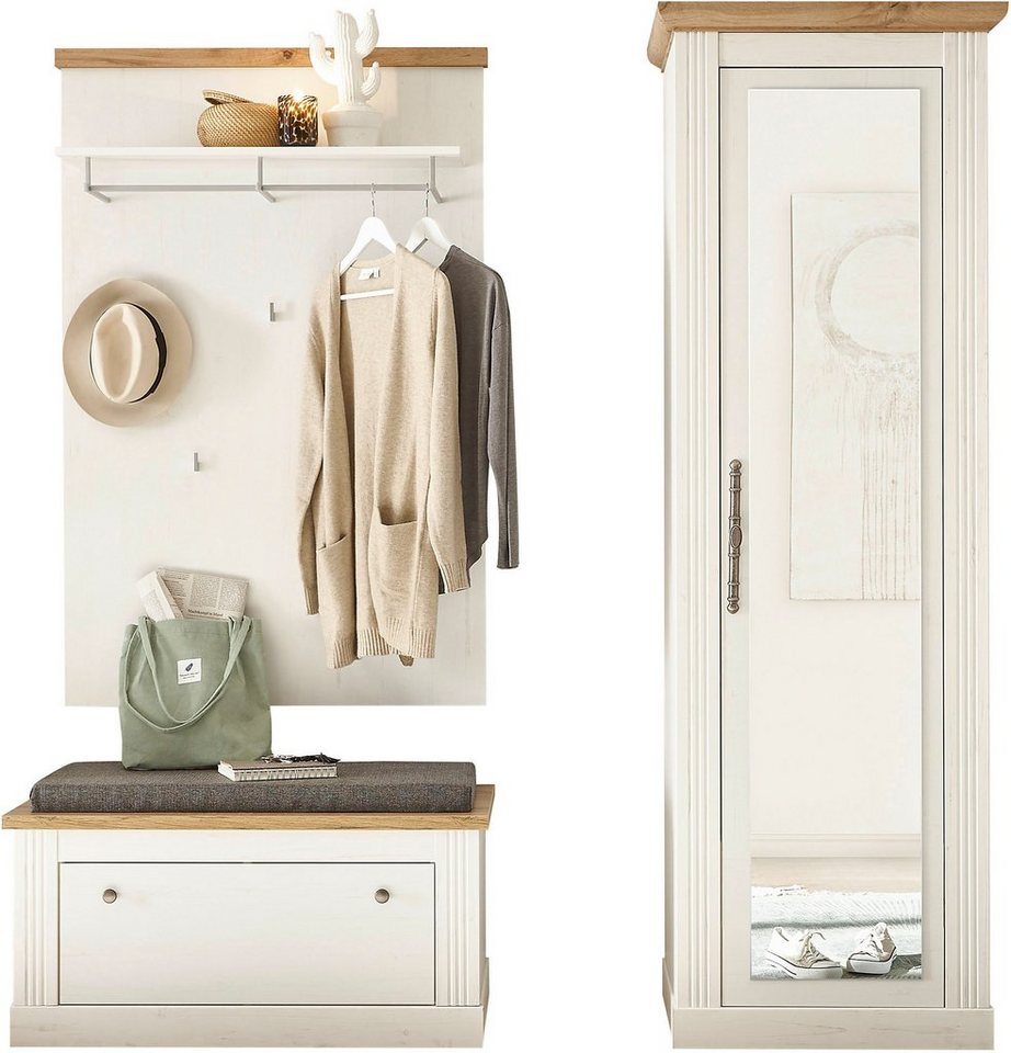 Sorgt für ein harmonisches Gesamtbild in deiner Einrichtung: Das Garderoben-Set im Landhausstil von Home affaire. Mit seinem schlichten Dekor lässt es sich zu vielen Wohnkonzepten ergänzen. Unterstrichen wird das Design durch attraktive Absetzungen in Holzoptik. Das Set besteht aus einem Paneel, Garderobenschrank sowie Schuhbank, die viel Stauraum offenbaren. Während das Paneel reichlich Platz für deine Jacken und Accessoires bietet, lassen sich in der Schuhbank deine Schuhe unterbringen. Gefertigt ist die Garderobenkombination aus einem FSC®-zertifizierten Material. Eignet sich ideal auch für kleine Räume: das Home affaire Garderoben-Set im Landhausstil.