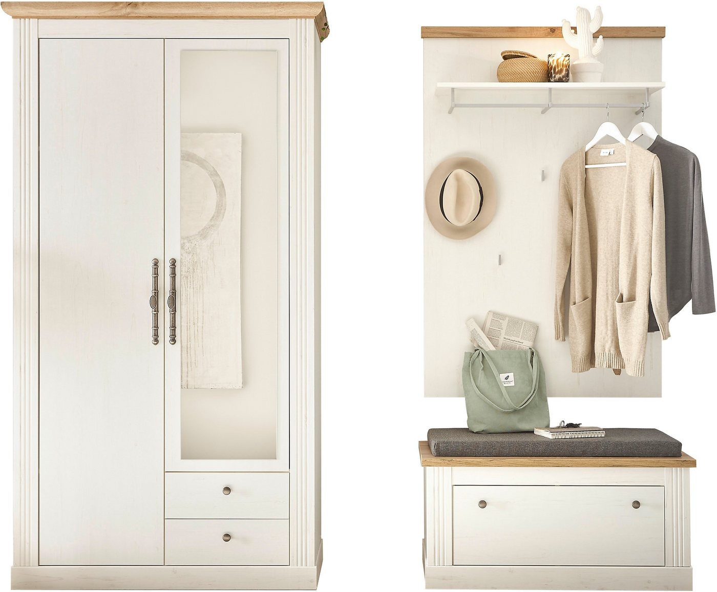 Verwandelt deine Diele in einen wohnlichen Eingangsbereich: Das Garderoben-Set im angesagten Landhausstil von Home affaire ist ein Gewinn für deine Einrichtung. Geprägt ist das Erscheinungsbild durch den ansprechenden Dekormix. Zu den weiteren Gestaltungsmerkmalen zählen die Griffe aus Metall. Im Garderobenmöbel Set sind eine Schuhbank mitsamt Sitzkissen, ein Paneel sowie ein Garderobenschrank enthalten. Daher kannst du Schuhe, Jacken, Taschen und Co. in diesem Dielenmöbel ordentlich verstauen. Auf der Sitzbank kannst du dich zudem gemütlich hinsetzen, um Schuhe an- oder auszuziehen. Ideal auch für kleine Räume: das Home affaire Garderoben-Set im Landhausstil.