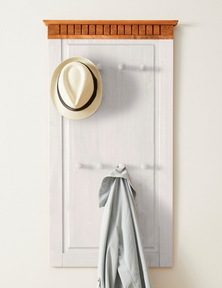 Markeninformationen , Seit 2001 begeistert uns Home affaire mit Landhausmöbeln zum Verlieben. Ob modern, romantisch oder natürlich traditionell – der Fantasie für wunderschönes Einrichten sind kaum Grenzen gesetzt., |Serie , Lisa, |Anzahl Haken , 8 St., |Hinweis Maßangaben , Alle Angaben sind ca.-Maße., |Belastbarkeit maximal , 5 kg, |Belastbarkeit Haken maximal , 1 kg kg, |Breite , 60 cm, |Höhe , 110 cm, |Tiefe , 4 cm, |Holzart , Kiefer, |Materialhinweis , Die Sichtbarkeit der Holzstruktur und Äste sind Teil der individuellen Ausstrahlung jedes einzelnen Möbelstückes. Da es sich um ein Naturprodukt handelt, kann sich die Oberfläche verändern., |Material Haken , Massivholz, |Material , Massivholz, |Farbe Haken , weiß, |Farbe , weiß/honig, |Oberflächenbearbeitung , geschliffen, |Oberflächenbehandlung , lackiert, |Oberflächenoptik , seidenglänzend, |Lieferzustand , zerlegt, |Aufbauhinweise , einfache Selbstmontage mit Aufbauanleitung, |Pflegehinweise , Bitte beachten Sie die Pflegehinweise gemäß dem beiliegenden Produkt- und Materialpass., |