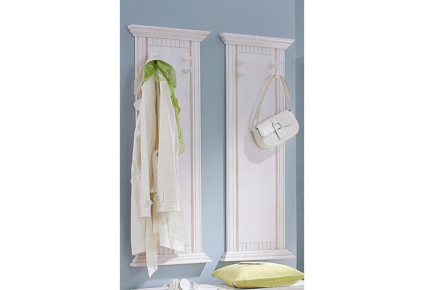 Die 2-teilige Garderobe von Home affaire bereichert mit ihrem zeitlosen Landhausstil diverse Eingangsbereiche. Die für dieses Design typischen dekorativen Fräsungen machen den Look aus. Eine natürliche Optik erhält das Paneel durch die massive Kiefer, die zudem für die Stabilität sorgt. An den Haken lassen sich griffbereit Jacken, Mäntel und Accessoires aufhängen. Aufgrund der geringen Maße fügt sich das Wandpaneel toll in große wie kleine Dielen ein. Individuell angeordnet schafft die zeitlose Landhaus-Garderobe im 2er-Set von Home affaire ein ordentliches und stilvolles Bild im Flur.
