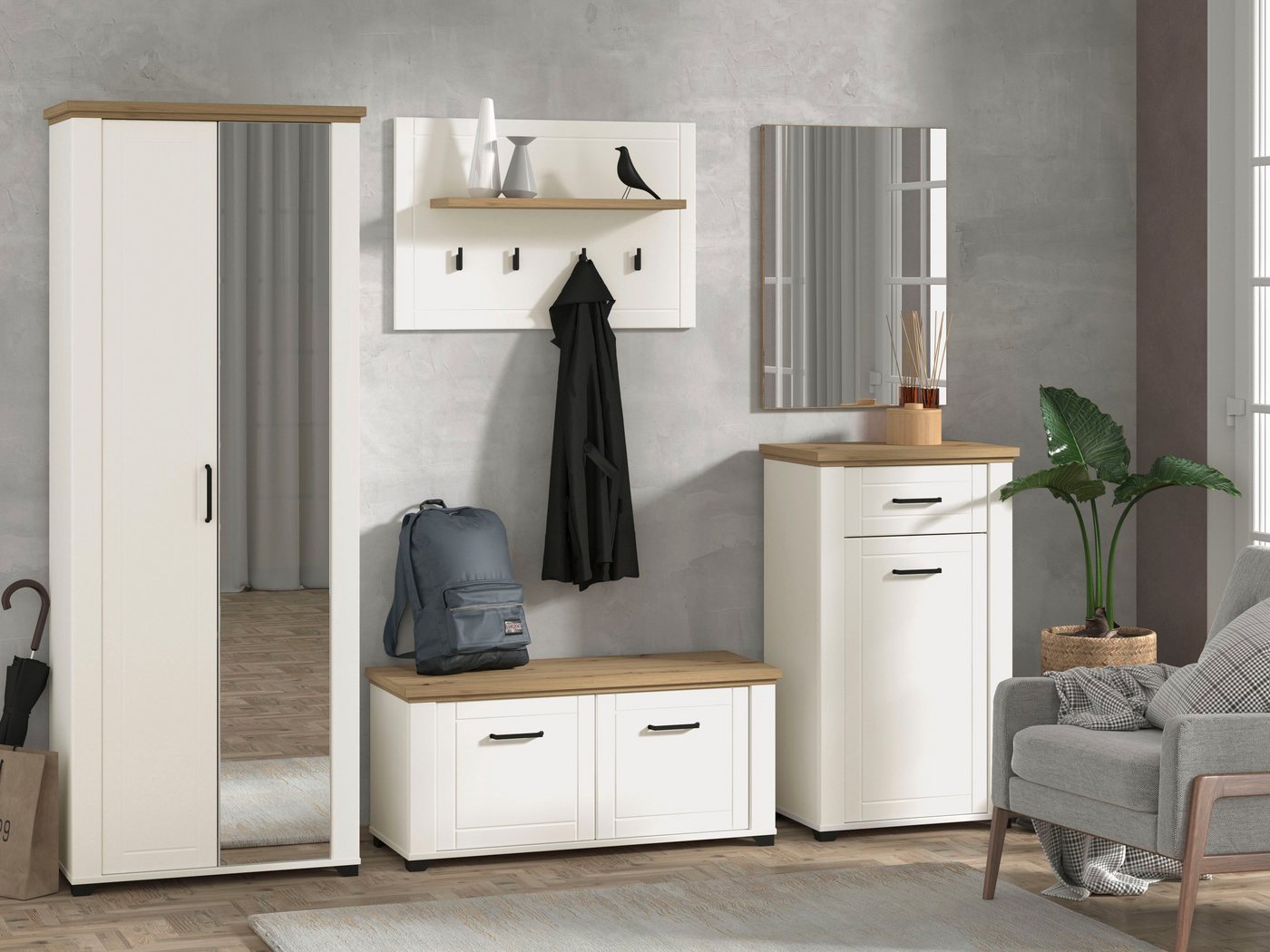 Bietet nützlichen Stauraum im Eingangsbereich: der hochwertig verarbeitete Garderobenschrank »Valencia« von Home affaire mit ABS-Schutzkanten. Das Flurmöbel begeistert in modernen Trendfarben mit Spiegeltür und Stangengriff. Hergestellt aus FSC®-zertifiziertem Holzwerkstoff, profitierst du im Weiteren von pflegeleichten Oberflächen. Im Inneren des Dielenschranks offenbaren sich großzügige Stauraummöglichkeiten. Am Kleiderhaken kannst du Jacken und Mäntel aufhängen, in den offenen Fächern lassen sich wahlweise Schuhe, Taschen oder Kleinkram lagern. Der Schrank steht dir in mehreren Farbvarianten zur Wahl, sodass du ihn perfekt auf Flur oder Diele abstimmen kannst. Begeistert mit viel Stauraum in modernem Design: der hochwertig verarbeitete Garderobenschrank »Valencia« von Home affaire mit ABS-Schutzkanten.
