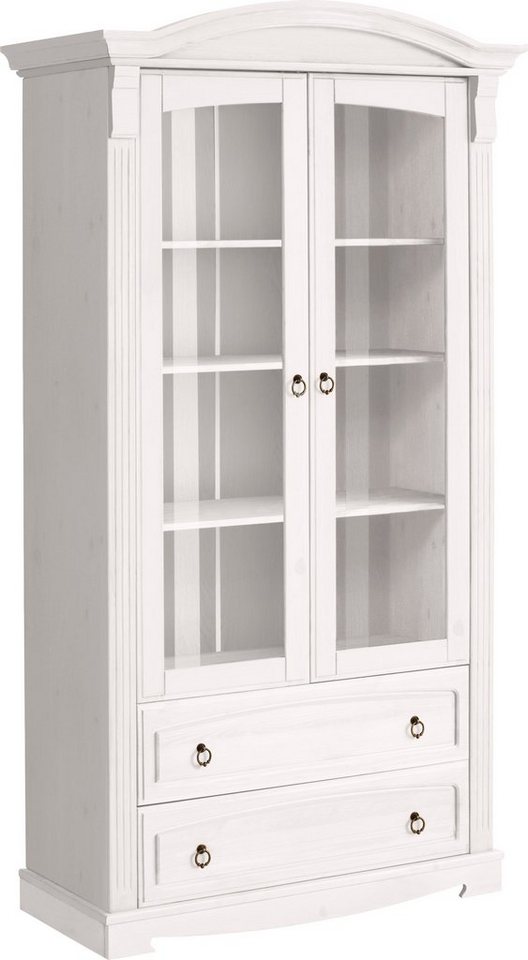 Die Vitrine »Anna« von Home affaire präsentiert den Landhaus-Stil in einer eleganten Form. Ausgestattet ist sie mit großen Glasfronten, die den Blick auf das Innere freigeben. Der ideale Platz, um Bücher, Sammelobjekte und dekorative Accessoires zu präsentieren. Erweitert wird das Stauraumangebot durch blickdichte Schubladenelemente im unteren Bereich. Diese lassen sich ebenso wie die Türen bequem mit den ringförmigen Griffen aus Metall öffnen. Hergestellt wird sie in hochwertiger Verarbeitungsqualität aus Massivholz mit FSC®-Zertifikat. Ergänzt das Wohn- oder Esszimmer um einen eleganten Akzent im Landhausstil: die Vitrine »Anna« von Home affaire.