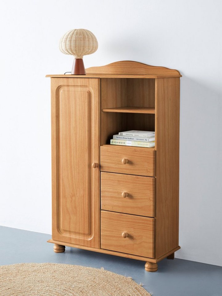 Neues Highboard gesucht? Dieses Highboard »Mette« von Home affaire bietet dir wertvollen Extra-Stauraum. Die Schubladen lassen sich komplett ausziehen und bieten dir weitere Unterbringungsmöglichkeiten. Die Einlegeböden sind variabel einsetzbar. So kannst du selbst über die Höhe der einzelnen Fächer bestimmen. Der Lack auf der Oberfläche kann das Holz vor Schmutz schützen und trägt zur längeren Haltbarkeit bei. Die einfachen Knopfgriffe sind langlebig und unterstreichen den Stil. Bei etwa 50 Kilogramm liegt die maximale Belastbarkeit. Modernes Wohnen Das Highboard versprüht eine ländliche Romantik. Zum Beispiel in Kombination mit Möbeln aus Holz oder Rattan wird das heimelige Ambiente stilecht ergänzt. Dazu können beispielsweise Fundstücke vom Flohmarkt und Antiquitäten den rustikalen Look ergänzen. Es gehört zur Mette Serie, die weitere Artikel in diesem Stil enthält. So kannst du ein harmonisches Gesamtbild zaubern. Dein neues Highlight zuhause — das Highboard »Mette« von Home affaire!