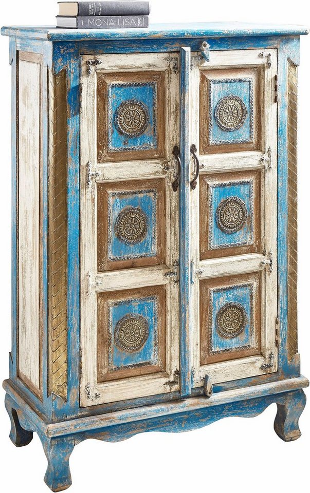 Die Vorzüge eines nostalgischen und zugleich stylischen Möbelstücks vereint das handgefertigte Highboard der Marke Home affaire. Es zeichnet sich durch die vielen unterschiedlichen, gewischten Farben in harmonischer Zusammenstellung aus. Weitere Akzente setzen die integrierten Schnitzereien auf den Fronten mit Rahmenoptik und die bewusst grob gehaltene, fühlbare Struktur des FSC®-zertifizierten, massiven Holzes. Der Schrank kann als Dielenschrank, als Wohnzimmermöbel und in vielen anderen Bereichen zum Einsatz kommen. Wo auch immer er genutzt wird, stellt er viel Stauraum zur Verfügung. Der Innenraum ist durch Einlegeböden praktisch unterteilt. Das von Hand gefertigte Home affaire Highboard verschönert das wohnliche Zuhause um einen wunderschönen Akzent.