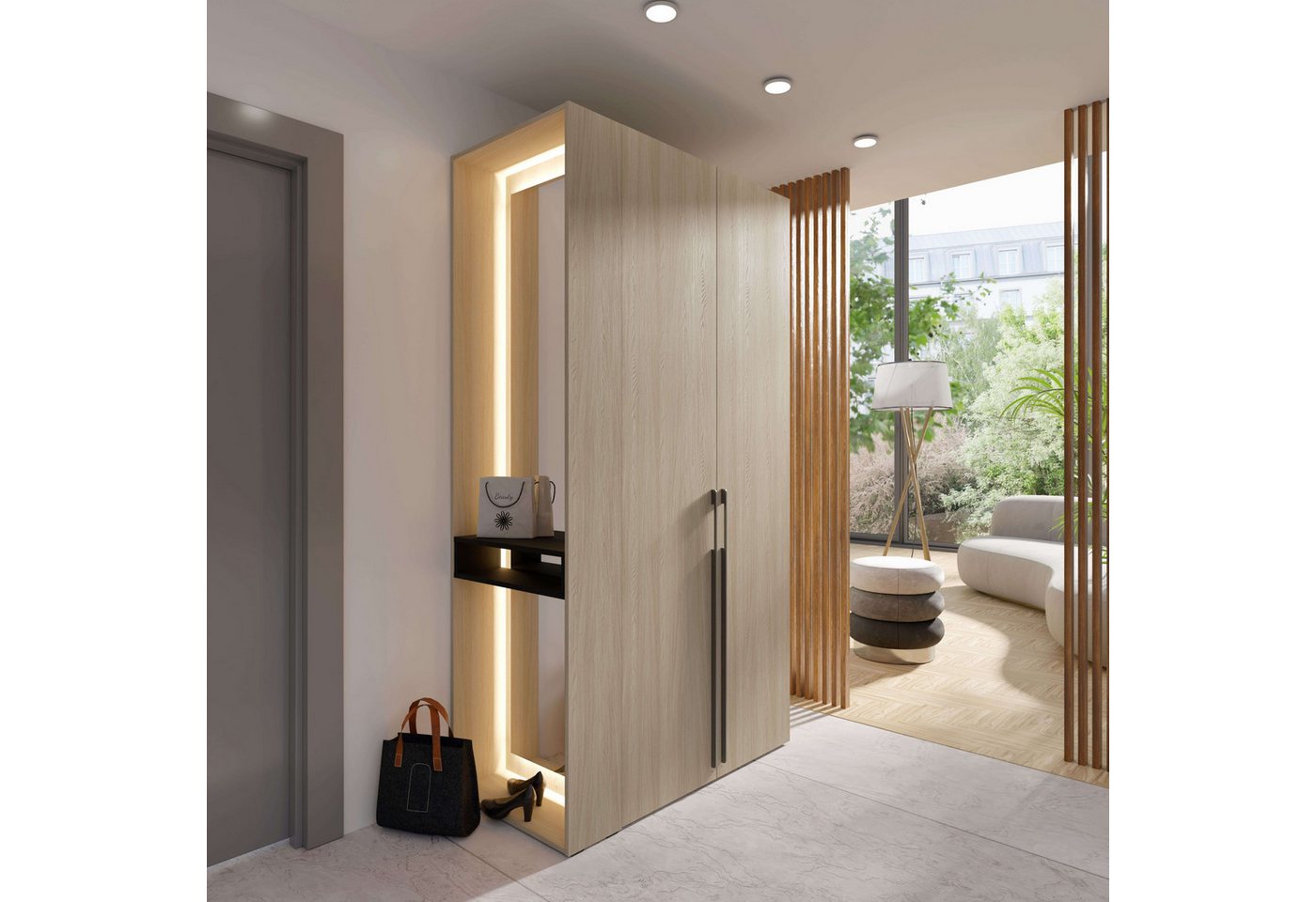 Kleiderschrank in funktionalem Design Funktionalität und Komfort stehen bei dem Kleiderschrank »TRENTO Garderobe, Wäscheschrank mit Spiegel und LED-Beleuchtung« von Home affaire im Vordergrund. Die klassischen Drehtüren haben den Vorteil, dass alle Fächer gleichzeitig geöffnet werden können. Das ist super, wenn man sich gerade ein Outfit zusammenstellt und einen Überblick über den gesamten Inhalt behalten möchte. Die Türen können dank der Dämpfung ganz sanft zugemacht werden. Aus unempfindlichem Melamin hergestellt Das Möbelstück aus Melamin überzeugt mit seiner kratzfesten Oberfläche, die es besonders pflegeleicht macht. Der Schrank ist außerdem mit ABS-Schutzkanten versehen. ABS ist ein Kunststoff, dessen Oberfläche besonders hart ist. Dadurch wird das Möbelstück ausgesprochen stoßsicher — praktisch zum Beispiel bei einem Umzug und gut geeignet für den alltäglichen Gebrauch. Der Schrank steht auf Gleitern aus Kunststoff. Sie sorgen dafür, dass der Boden nicht zerkratzt wird. Hergestellt wurde das Produkt in Polen. Modernes Wohnen Der Kleiderschrank versprüht eine ländliche Romantik. Zum Beispiel in Kombination mit Möbeln aus Holz oder Rattan wird das heimelige Ambiente stilecht ergänzt. Auflockernde Farbtupfer können beispielsweise mit Deko-Elementen wie bunten Vasen oder Kerzen eingebracht werden. Er gehört zur TRENTO Serie, die weitere Artikel in diesem Stil enthält. So kannst du ein harmonisches Gesamtbild zaubern. Hängen, legen, sortieren — das funktioniert ganz übersichtlich mit dem Kleiderschrank »TRENTO Garderobe, Wäscheschrank mit Spiegel und LED-Beleuchtung« von Home affaire.