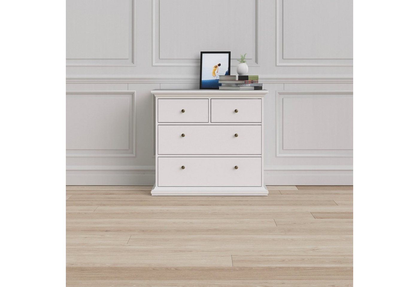Die Kommode »Paris« von Home affaire im Landhaus-Stil zieht alle Blicke auf sich. Ein geschmackvolles Gestaltungselement ist die abgesetzte Boden- sowie Deckplatte. Abgerundet wird der Look durch die formschönen Griffe. So entsteht das romantische Gesamtbild des Möbelstücks. Dank des großen Stauraumangebotes bietet dieser Schrank viel Platz, um darin private Dinge aufzubewahren. Die Ablagefläche lädt außerdem zum Dekorieren ein. Das Möbelstück ist vielseitig einsetzbar: Im Wohnzimmer finden Unterlagen und Fotos hier ihren Platz, im Schlafzimmer dient sie als Wäschekommode und in der Diele können hier Taschen, Schals oder Mützen verstaut werden. Für die Fertigung wird ein FSC®-zertifizierter Holzwerkstoff verwendet. Die Kommode »Paris« von Home affaire im Landhaus-Stil fügt sich harmonisch in jeden Einrichtungsstil ein.