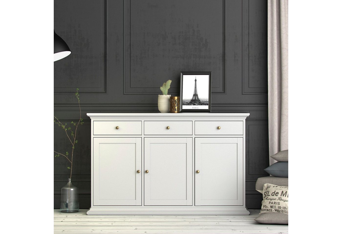 Für einen stilvollen Einrichtungsakzent sorgt die Kommode »Paris« von Home affaire mit viel Stauraum. Ihr moderner wie auch eleganter Stil in dezenter farblicher Gestaltung fügt sich mühelos in unterschiedliche Wohnkonzepte ein. Hochwertige Knopfgriffe aus Metall runden das Erscheinungsbild harmonisch ab. Nutzen lässt sich die Anrichte in jedem Raum, ob in deinem Wohnzimmer, in Flur und Diele oder im Arbeitsbereich. Hier bietet sie dir in ihren Schubladen und hinter den Türen großzügige Stauraummöglichkeiten. Wahlweise lassen sich hier Bücher, Spiele oder Wohnaccessoires verstauen. Dank einer mitgelieferten Aufbauanleitung kannst du den Schrank schnell und einfach montieren. Gefertigt aus langlebigem, FSC®-zertifiziertem Material: die Kommode »Paris« von Home affaire mit viel Stauraum.