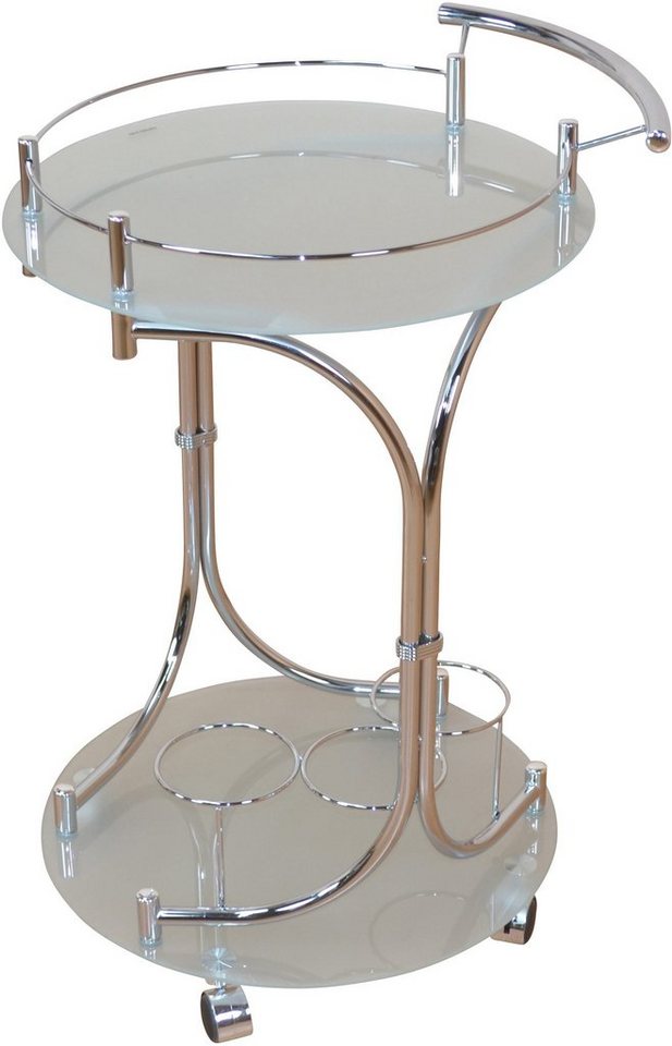 Dekorativer Alltagshelfer: Dieser tolle Home affaire Servierwagen mit Rollen ist eine elegante Einrichtungsidee mit hohem Nutzwert. Das kunstvoll geschwungene Design und sein wertiger Charakter setzen reizvolle optische Akzente. Dieser formschöne Beistellwagen mit funktionalem Griff verfügt über ein stabiles Gestell aus Stahlrohr, das in verschiedenen attraktiven Farben lieferbar ist. Er ist mit Ablageböden aus Sicherheitsglas sowie nützlichen Flaschenhaltern ausgestattet und steigert den Komfort bei der Bewirtung von Gästen. Zur sicheren Handhabung sind einige der Rollen feststellbar. Die pflegeleichten Oberflächen ermöglichen eine einfache Reinigung des auch wunderbar als Küchenrollwagen verwendbaren Wohnaccessoires. Der dank seiner leichtgängigen Rollen flexibel einsetzbare Servierwagen von Home affaire besticht durch seine dekorativen und praktischen Eigenschaften, die den Wohnalltag angenehmer gestalten.