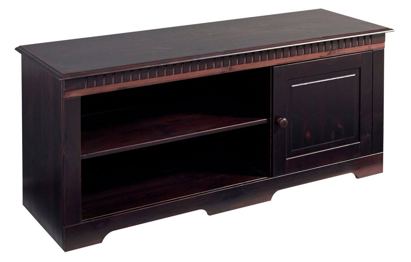 Das stilvolle Lowboard sorgt mit seiner zeitlosen Optik für ein geschmackvolles Ambiente im Wohnbereich. Als TV-Möbel lädt es zu einem netten Fernsehabend mit Freunden oder der Familie ein. Die massive Verarbeitung aus FSC®-zertifizierten Kiefernholz schenkt lange Freude an diesem Möbelstück. Leichtläufige Schubkästen dienen als ausziehbarer Stauraum. Die offenen Fächer bieten beispielsweise Platz für die hauseigene DVD-Sammlung und sind in der Höhe verstellbar. In einem Fach hinter der Tür finden viele Alltagsdinge ihren Platz. Der Türanschlag befindet sich auf der rechten Seite. Eine Aussparung für Kabel in der Rückwand des Mediamöbels sorgt für ein aufgeräumtes, kabelloses Erscheinungsbild. Das Lowboard von Home affaire: praktisch und schön zugleich.