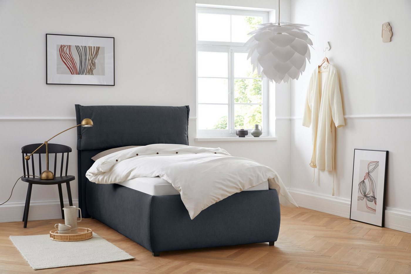 Mit Bettkasten ausgestattetes Bett Bei diesem Polsterbett »Jenson« von Home affaire hast du dank des praktischen Bettkastens Stauraum für Decken, Laken und Kissen. Das Kopfteil ist 115 cm hoch. Das Material für die Montage ist inklusive, sodass der Gang zum Baumarkt dafür nicht notwendig ist. Bei diesem Produkt ist nur eine Teilmontage erforderlich, wodurch es mit wenig Aufwand schnell aufgebaut ist. Bezug aus Strukturstoff Das Bettgestell besteht aus modernem Holzwerkstoff und ist daher sehr formstabil und tragfähig. Der Bezug zeichnet sich durch die im 90° Winkel überkreuzende Fäden aus, die dem Stoff seine charakteristische Struktur verleihen. Das Herstellungsland Deutschland ist für seine hohen Sicherheitsstandards und gute Qualität bekannt. Skandinavisches Design richtig kombiniert Einrichtungstipp gefällig? Farben wie Weiß, Créme und Beige komplettieren den skandinavischen Einrichtungsstil des Polsterbetts und sorgen für ein unbeschwertes Ambiente. Grüne Zimmerpflanzen und Accessoires in Gelb oder Türkis können dabei farbliche Akzente in den Raum bringen. Mit schnörkellosen Möbeln in Kombination mit hellen Hölzern wohnst du ganz nach nordischem Vorbild. Das Produkt gehört zur Jenson Serie, die weitere Artikel in diesem Stil enthält. Auch so kannst du ein harmonisches Gesamtbild zaubern. Für einen guten Start in den Tag — mit dem Polsterbett »Jenson« von Home affaire.