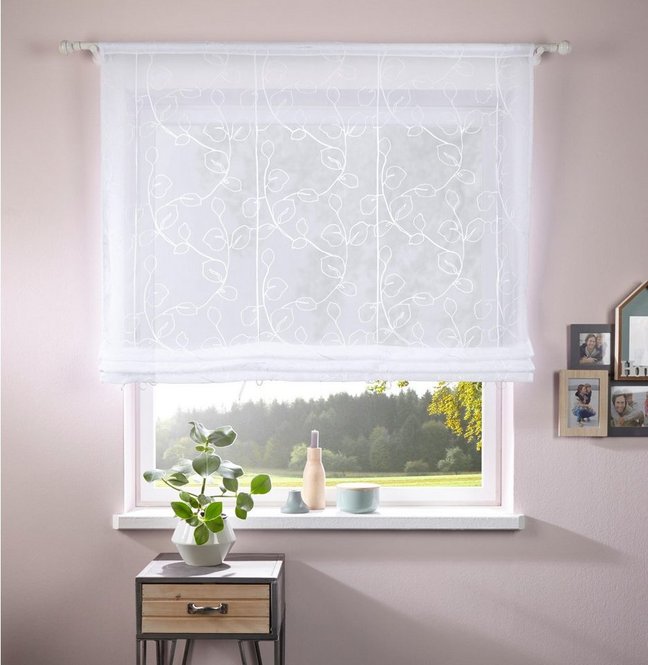 Ein dekorativer Hingucker am Fenster ist das transparente Raffrollo »Adele« von Home affaire. Designt mit einer schönen Stickerei in floraler Optik verschönert er den Raum im Handumdrehen. Mit seiner schlichten Farbe lässt sich der Sichtschutz zu vielseitigen Wohnkonzepten ergänzen. Einen attraktiven Akzent setzt er im Wohnbereich sowie im Arbeits- und Schlafzimmer. Zum Anbringen an die Gardinenstange ist die Fensterdekoration mit einem praktischen Stangendurchzug versehen. Hergestellt wird das Wohnaccessoire aus pflegeleichtem Voile. Zur Reinigung lässt sich das Material bei bis 30 °C im Schonwaschgang behandeln. Punktet im modernen Stil: das transparente Raffrollo »Adele« von Home affaire.