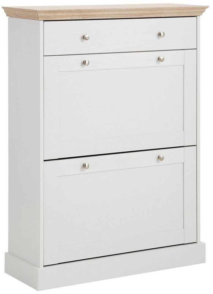 Ordnung halten leicht gemacht: Der Schuhschrank »Binz« von Home Affaire ist die Antwort auf die lästige Frage »Wohin nur mit den Schuhen in der Diele?«. Denn diese Schuhkommode bietet reichlich Stauraum für bis zu einem Dutzend Paar Schuhe. Diese lassen sich einfach in den Fächern hinter den beiden Klappen verstauen. Die Schublade darüber bietet reichlich Stauraum für Schals, Mützen und Co. Alles, was beim Verlassen des Hauses mitgenommen werden muss, lässt sich perfekt auf der breiten Ablage drapieren. Und auch optisch ist diese Kommode absolut überzeugend: Der moderne Landhausstil verbreitet eine gemütliche Atmosphäre. Und die hochwertig verarbeitete Rahmenfront, die fühlbare Struktur der Oberfläche sowie die Griffe aus Metall, machen den Schuhschrank »Binz« von Home Affaire zu einem echten Highlight in jedem Flur.