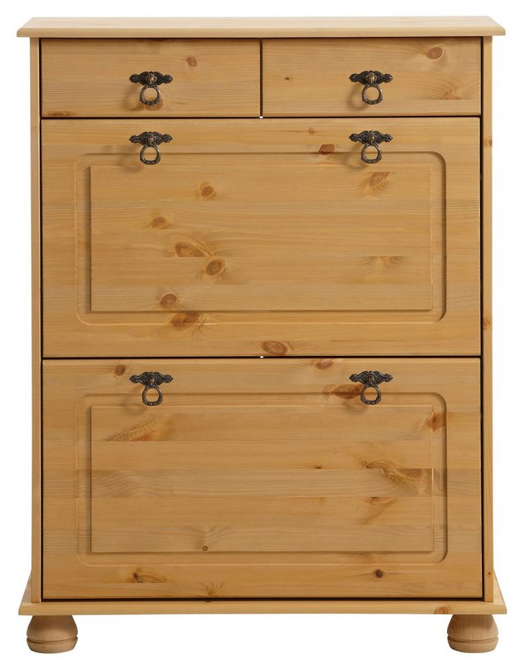 Attraktiver Hingucker: Die hübsche Schuhkommode »Finca« von Home affaire bereichert den Flur oder die Diele um ein optisch ansprechendes Qualitätsprodukt und bietet durchdachten Stauraum. In den leichtläufigen Schubkästen auf Metallauszügen lassen sich Mützen, Tücher und andere Accessoires optimal verstauen, zudem bieten mehrere Fächer hinter praktischen Schrankklappen geräumigen Platz für diverse Schuhpaare. Der aus Massivholz gefertigte Schuhschrank ist in unterschiedlichen gelungenen Ausführungen erhältlich, sodass bereits vorhandene Wohnkonzepte perfekt berücksichtigt werden können. Edle Griffe aus Metall und ins Auge fallende Kugelfüße runden das schöne Erscheinungsbild im klassischen Landhausstil gekonnt ab. Die Home affaire Schuhkommode »Finca« vermag für ein wohnliches Ambiente zu sorgen und setzt hübsche Akzente.