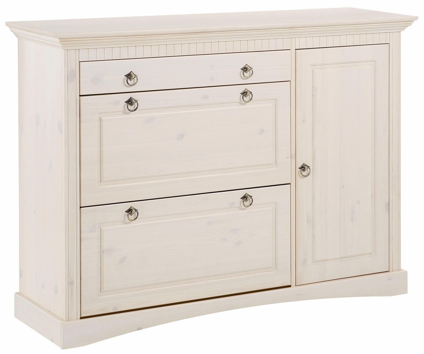 Beeindruckend durch die rustikale Optik ist der Schuhschrank aus Massivholz »Rustic« von Home affaire. Bestellbar ist er in verschiedenen Farben und Oberflächenveredelungen. In jeder Variante sorgt die sichtbare Struktur für den natürlichen Gesamteindruck. Unterstützt wird der rustikale Eindruck durch die harmonisch passenden Metallgriffe. Im Innenraum ist reichlich Platz für zahlreiche Schuhe vorhanden. Für kleinere Utensilien wie das Schuhputzzeug oder Schnürsenkel steht die Schublade zur Verfügung. Hinter der blickdichten Tür lassen sich weitere Accessoires wohlaufgeräumt aufbewahren. Verwendet wird für die Schuhkommode ausschließlich Holz. Zeitlos wohnen: Der Home affaire Schuhschrank »Rustic« aus Massivholz hat dafür die optimalen Voraussetzungen.