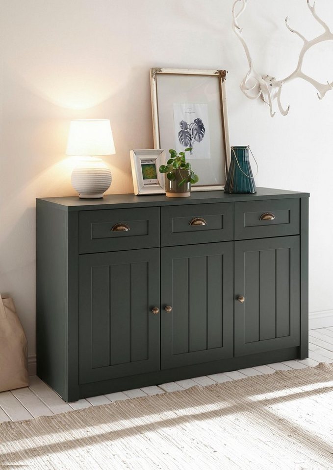 Durchdachtes Design trifft auf ansprechende Optik: Das Sideboard »Ascot« von Home affaire im Landhausstil ist ein Gewinn für dein Zuhause. Eine tolle Holzoptik und die charakteristischen Fräsungen bestimmen das Erscheinungsbild. Die messingfarbenen Muschelgriffe runden das Design auf stimmige Weise ab. Neben dem Look punktet die Kommode durch ihr Stauraumangebot. Hinter den Schranktüren befinden sich großzügig bemessene Fächer, in denen du private Gegenstände unterbringen kannst. Kleinigkeiten finden ihren Platz in den Schubladen. Du kannst die Anrichte als Stauraummöbel im Wohnbereich oder als Wäschekommode im Schlafzimmer einsetzen. Ideal auch für kleine Räume: das Sideboard »Ascot« von Home affaire im Landhausstil.