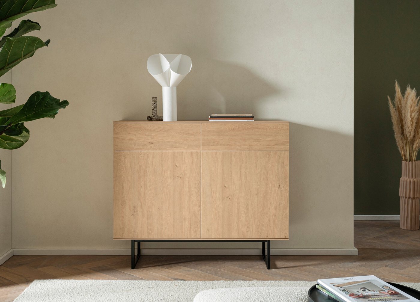 Attraktiver Schrank für dein Zuhause Ob im Wohnzimmer, Schlafzimmer oder Flur — Mit diesem Sideboard »Lund, moderner Schrank, Kommode mit Kufengestell« von Home affaire schaffst du mehr Stauraum und Platz für deinen Flatscreen oder schöne Deko-Elemente. Das Möbelstück besteht aus Holzwerkstoff und ist daher sehr formstabil und ausgesprochen tragfähig. Das Produkt wurde in Europa gefertigt. Einrichtung im Modern-Look Du fragst dich, wie sich das Möbelstück kombinieren lässt? Hier eine kleine Inspiration für dich: Die Ästhetik des modernen Stils ist reduziert und strahlt eine schlichte Eleganz aus. Um Akzente zu setzen, eignen sich beispielsweise farbige Vasen gut, die entweder mit Blumen oder auch mit bunten Lichterketten dekoriert werden können. Es gehört zur Lund Serie, die weitere Artikel in diesem Stil enthält. So kannst du ein harmonisches Gesamtbild zaubern. Für das Wohlfühlgefühl zuhause — das Sideboard »Lund, moderner Schrank, Kommode mit Kufengestell« von Home affaire!