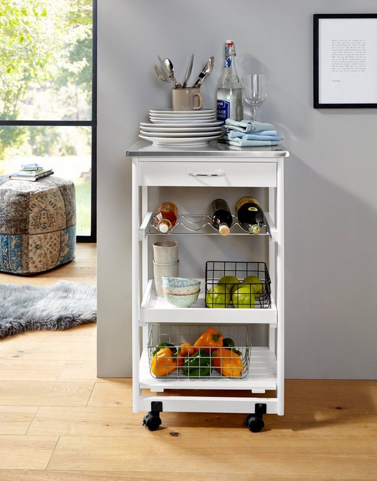 Für die Aufbewahrung von Küchenutensilien, Vorratsgläsern und Flaschen ist dieser praktische Küchenrollwagen von Home affaire genau das Richtige. Er kann in Küche oder Essbereich aufgestellt und als ergänzendes Möbelstück genutzt werden. Genauso kann er als Transportmittel zwischen den Räumen dienen. Auf den verschiedenen Ebenen, davon eine nur für Flaschen, lassen sich Geschirr, Gläser, Servietten und vieles mehr unterbringen. Zudem verfügt der Servierwagen über ein Edelstahltop, das optisch ein schöner Kontrast ist. Modern und vielfach einsetzbar: der praktische Küchenrollwagen von Home affaire.