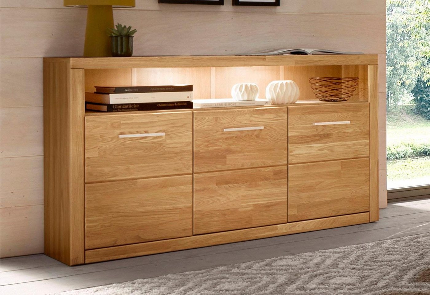 Dieses schöne Sideboard mit Türen weiß durch sein klares Design einen stilvollen Akzent im Wohnbereich zu setzen. Dabei erfüllt das Möbel dekorative und praktische Ansprüche gleichermaßen. Es bietet viel Stauraum im Inneren, aufgeteilt in offene sowie geschlossene Ablagebereiche hinter den Türen. Diese lassen sich bestens nutzen, um persönliche Dinge unterzubringen. Das Sideboard kommt ebenfalls als funktionale Anrichte für den Essbereich infrage, um wertvolles Geschirr sowie Besteck sicher und staubgeschützt aufzubewahren. Bei der Herstellung werden massive Kernbuche und Eiche kombiniert mit FSC®-zertifiziertem Teilmassivholz verwendet. Die geölten Oberflächen sind pflegeleicht, die Türen mit formschönen Metallgriffen ausgestattet. Dieses schicke Sideboard mit Türen strahlt mit seinem klaren Design ein stilvolles Flair im eigenen Zuhause aus.