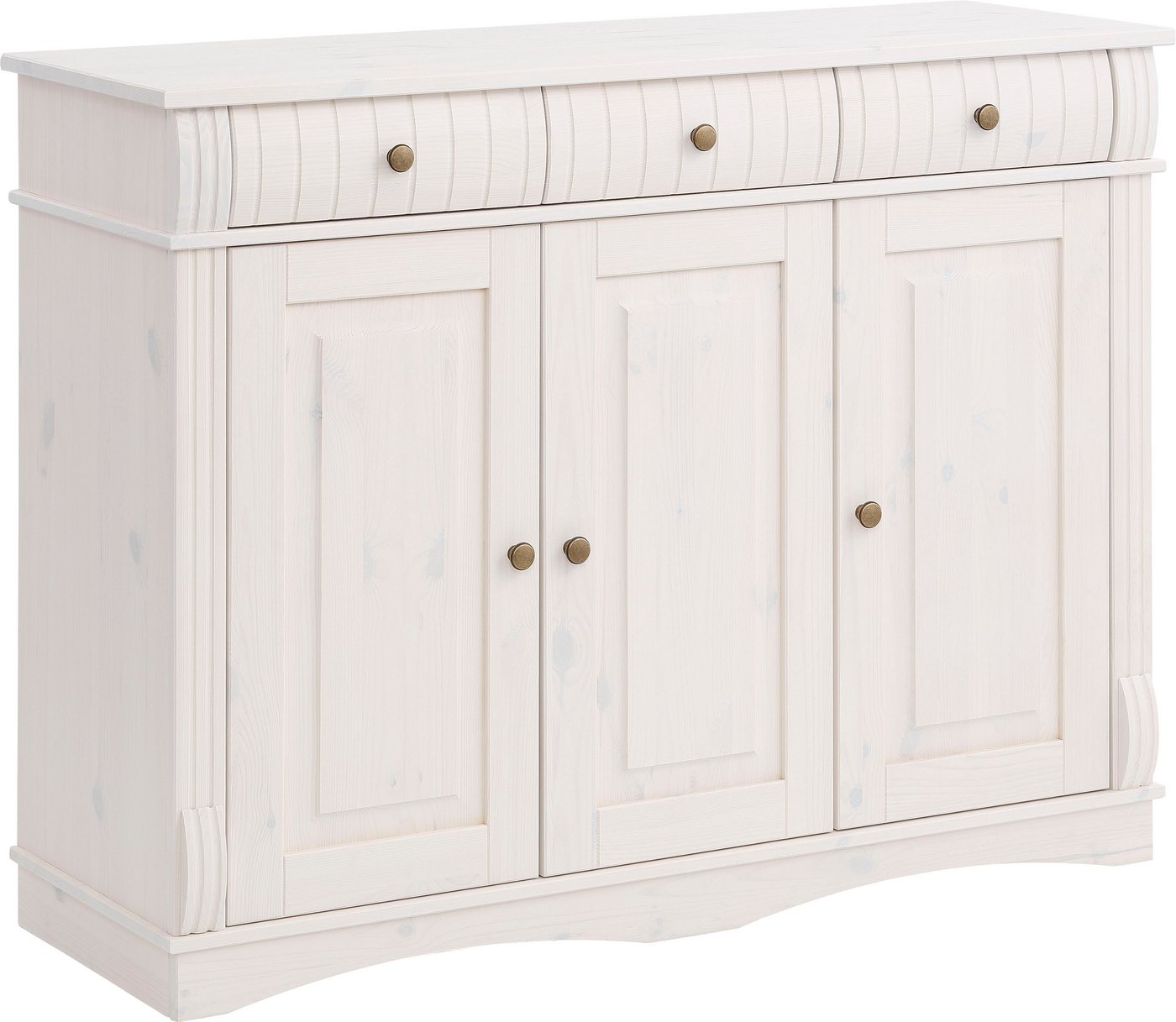 Ideal für kleine Räume: Das Sideboard »Teresa« von Home affaire in hochwertiger Verarbeitung kommt im modernen Landhausstil daher. Die Anrichte ist aus einem FSC®-zertifizierten Massivholz gefertigt, was ihr ein außergewöhnliches Flair verleiht. Besonders hübsch sind die Fräsungen im Frontbereich sowie die auffälligen runden Griffe in Metalloptik. Zudem bietet die Kommode reichlich Stauraum: Hinter den Schranktüren befinden sich Holzeinlegeböden und die Schubladen bieten noch mehr Platz. Die breite Ablagefläche lädt zusätzlich zum Dekorieren ein. Damit ist das Sideboard »Teresa« von Home affaire in hochwertiger Verarbeitung ideal geeignet, um im gesamten Wohn- und Schlafbereich für Stauraum zu sorgen.