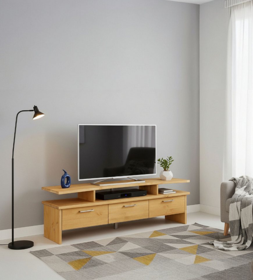 Das attraktive TV-Lowboard »Ixo« aus dem Hause Home affaire begeistert durch seine raffinierte Optik und die durchdachte Aufteilung. Es verfügt über mehrere offene Fächer und Schubkästen, die viel Stauraum bieten. Die oberste Ablage empfiehlt sich für die Aufstellung des Fernsehgerätes. Darunter können Quellgeräte wie ein Kabel-/Satreceiver oder ein Blu-ray-Player untergebracht werden. Bücher, DVDs oder andere Utensilien finden in den geräumigen Schubladen mit Metallauszügen übersichtlich Platz. Gefertigt ist der Fernsehtisch aus Massivholz. Er überzeugt durch seine hochwertige Verarbeitung und pflegeleichten Oberflächen. Der moderne Stil des TV-Boards fügt sich harmonisch in nahezu jede Einrichtung ein. Somit bietet das TV-Lowboard »Ixo« von Home affaire dank geschickter Aufteilung eine raffinierte Optik.