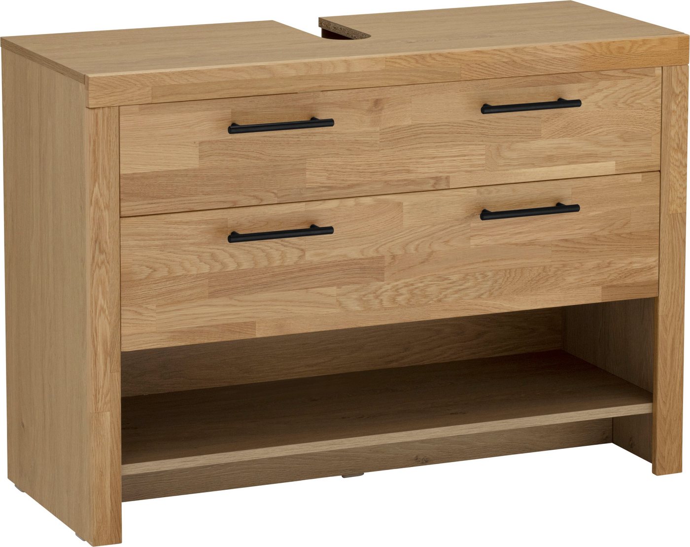 Mit genügend Stauraum begeistert dieser zeitlose Waschbeckenunterschrank »Satori« von Home affaire. Er zeichnet sich durch eine schöne Holzoptik in unterschiedlichen Tönen aus und ist mit kontraststarken Stangengriffen aus Metall versehen. Die Front und der Rahmen bestehen aus massivem Eichenholz. Der Badschrank harmoniert perfekt mit Einrichtungen im modernen und rustikalen Design. In seinen beiden Schubladen findest du großzügige Aufbewahrungsmöglichkeiten für deine Badutensilien. Im offenen Fach lassen sich beispielsweise Körbe oder dekorative Accessoires platzieren. Hergestellt wird der Waschbeckenschrank mit Front und Rahmen aus massivem Eichenholz. Schafft eine warme und behagliche Atmosphäre in deinem Bad: der zeitlose Waschbeckenunterschrank »Satori« von Home affaire.