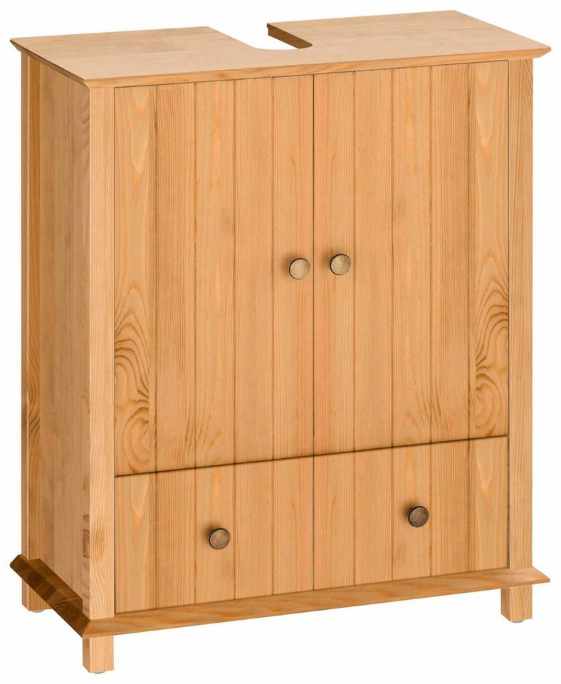 Der massive Waschbeckenunterschrank »Vili« von Home affaire verschönert deine Badezimmereinrichtung mit seinem puristischen Design. Er beeindruckt im angesagten Landhausstil und zeichnet sich durch eine schöne Holzoptik aus. Hiermit lässt sich der Waschbeckenschrank zu verschiedenen Einrichtungen kombinieren – ob zeitlos oder puristisch. Hinter den Türen und in der Schublade offenbart er funktionalen Stauraum für deine Badartikel. Hergestellt ist der Badezimmer-Unterschrank aus FSC-zertifiziertem Massivholz mit Griffen aus Metall. Seine Oberfläche punktet mit pflegeleichten Merkmalen. Zaubert ein gemütliches Ambiente in deinem Bad: der massive Waschbeckenunterschrank »Vili« von Home affaire.